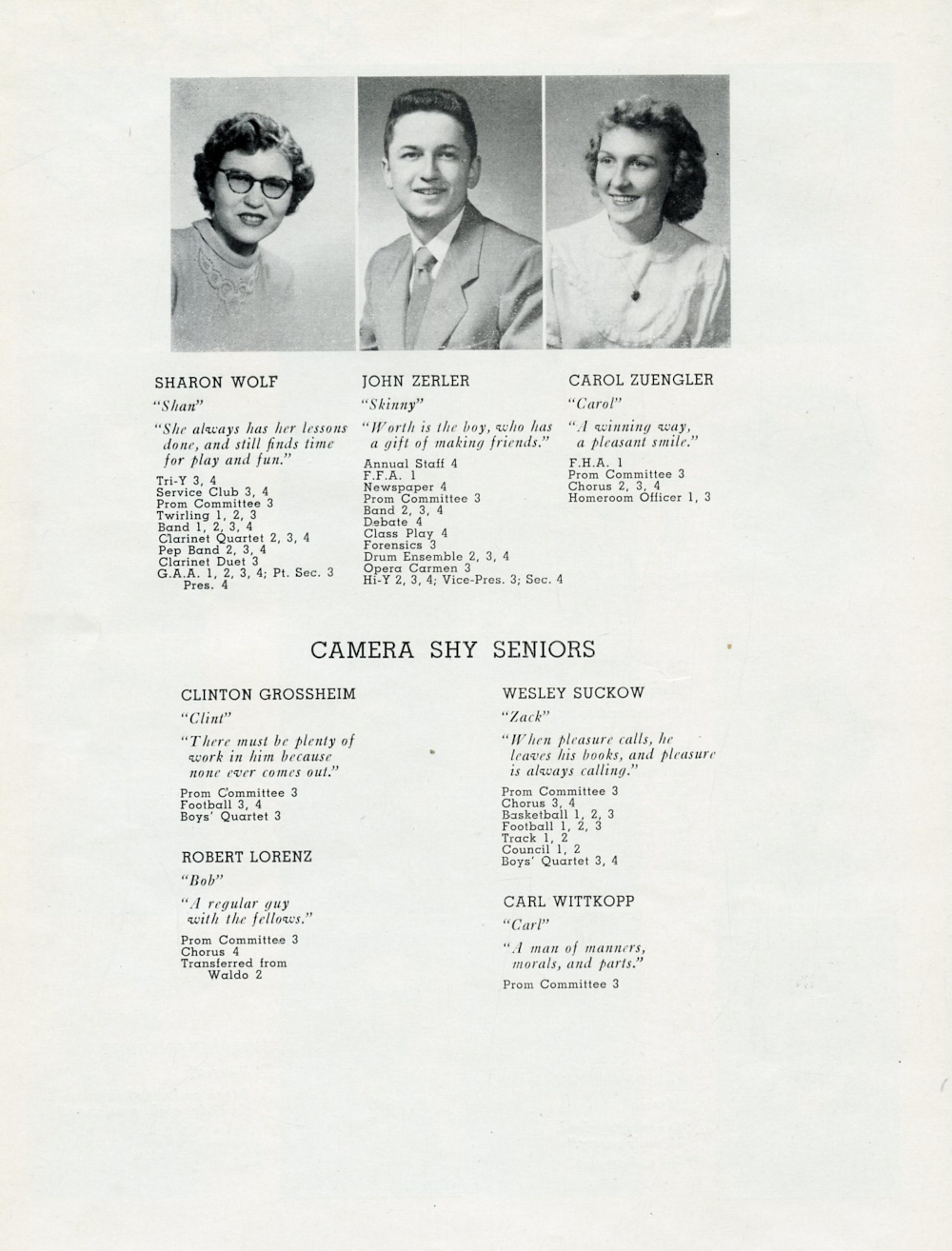 1951 Plymouth High School Yearbook Page 28: Sharon Wolf, John Zerler, Carol Zuengler, Clinton Grosshein, Robert Lorenz, Wesley Suckow, Carl Wittkopp.