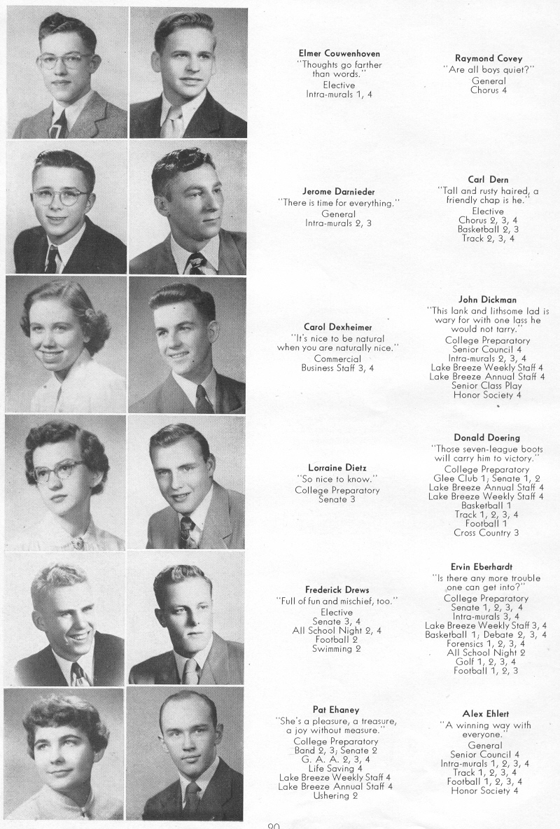 1951 Sheboygan Central High School, Page 20: Elmer Couwenhoven, Raymond Covey, Jerome Darnieder, Carl Dern, Carol Dexheimer, John Dickman, Lorraine Dietz, Donald Doering, Frederick Drews, Ervin Eberhardt, Pat Ehaney, Alex Ehlert.