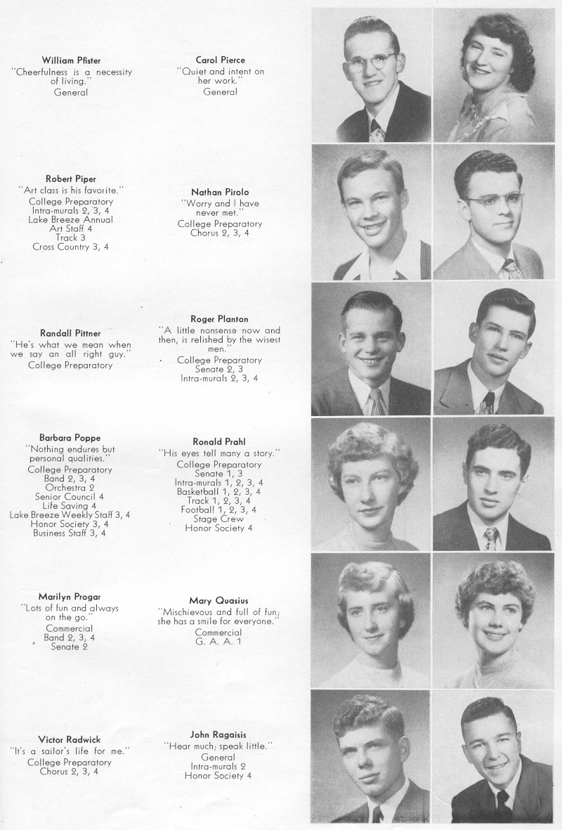 1951 Sheboygan Central High School, Page 35: William Pfister, Carol Pierce, Robert Piper, Nathan Pirolo, Randall Pittner, Roger Planton, Barbara Poppe, Ronald Prahl, Marilyn Progar, Mary Quasius, Victor Radwick, John Ragaisis.