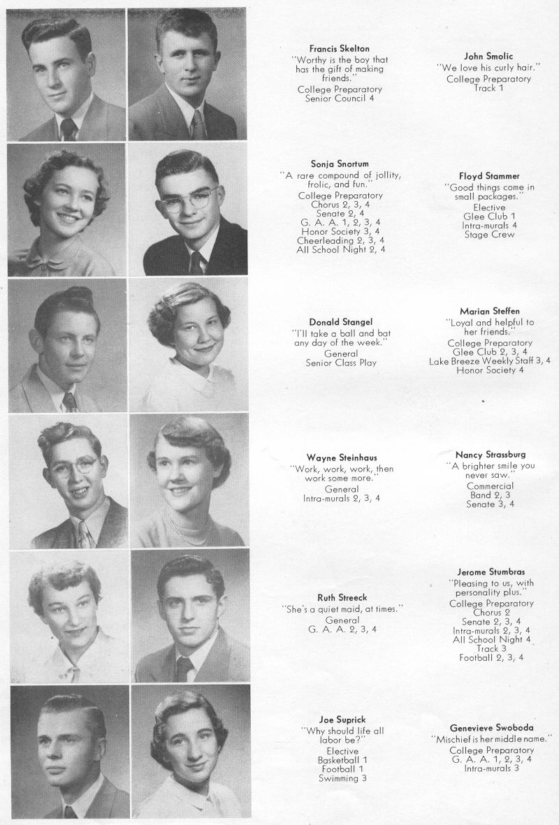 1951 Sheboygan Central High School, Page 40: Francis Skelton, John Smolic, Sonja Snortum, Floyd Stammer, Donald Stangel, Marian Steffen, Wayne Steinhaus, Nancy Strassburg, Ruth Streeck, Jerome Stumbras, Joe Suprick, Genevieve Swoboda.