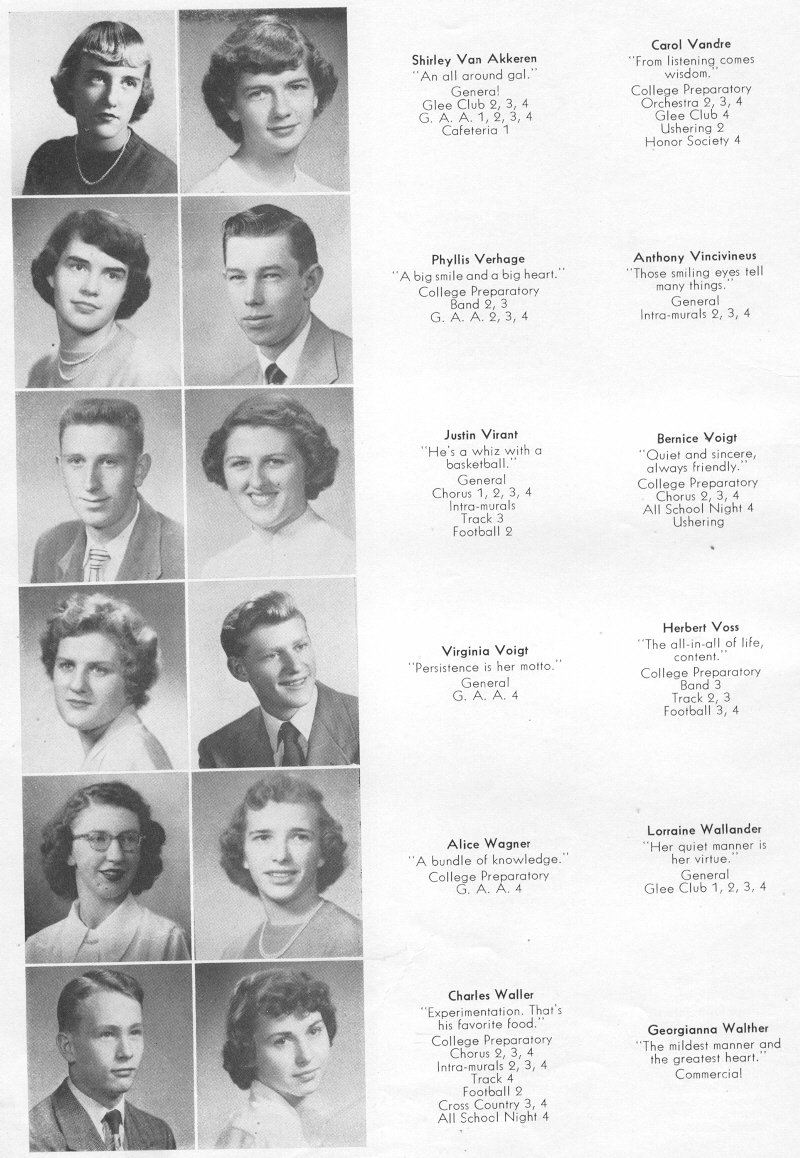 1951 Sheboygan Central High School, Page 42: Shirley Van Akkeren, Carol Vandre, Phyllis Verhage, Anthony Vincivineus, Justin Virant, Bernice Voigt, Virginia Voigt, Herbert Voss, Alice Wagner, Lorraine Wallander, Charles Waller, Georgianna Walther.