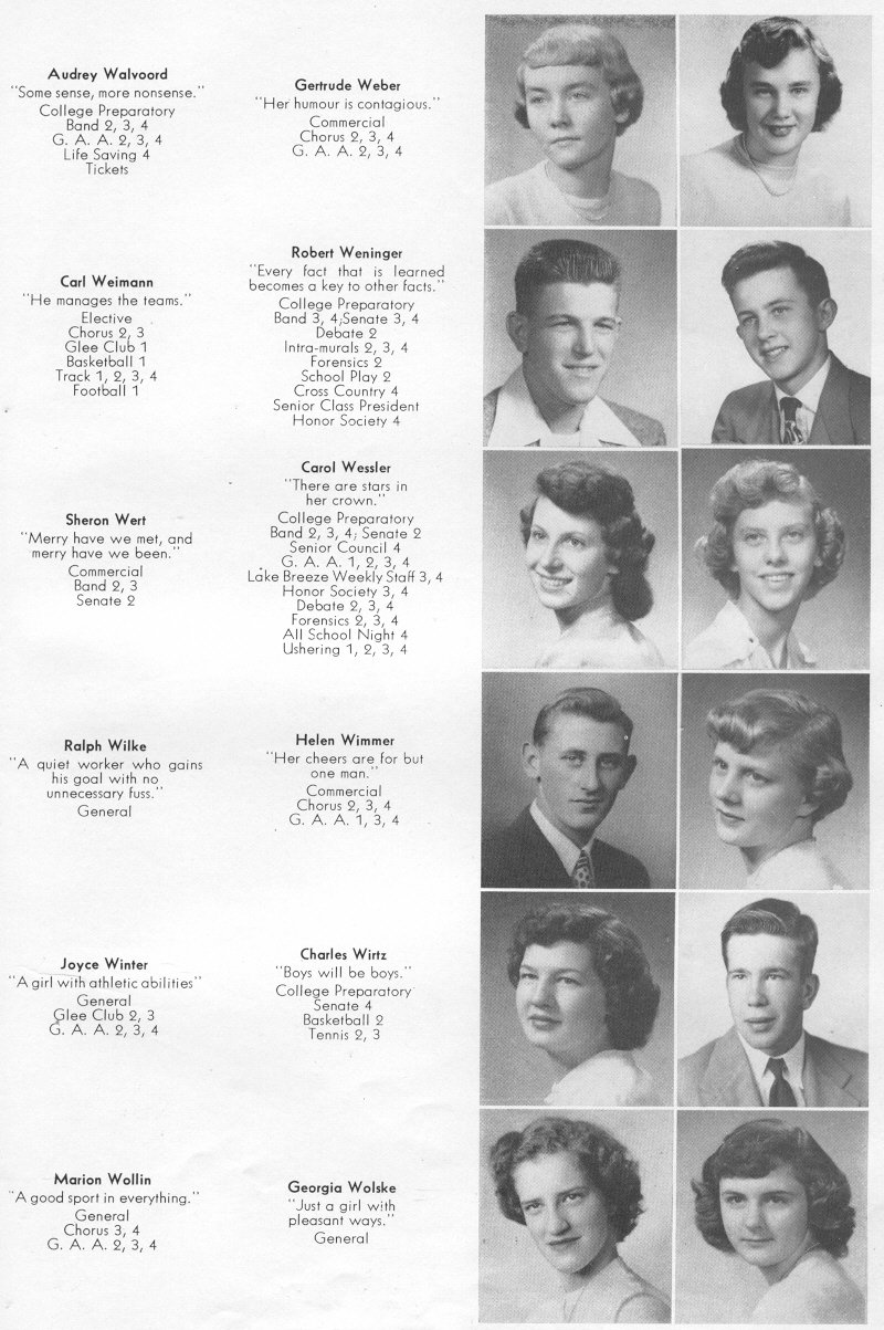 1951 Sheboygan Central High School, Page 43: Audrey Walvoord, Gertrude Weber, Carl Weimann, Robert Weninger, Sheron Wert, Carol Wessler, Ralph Wilke, Helen Wimmer, Joyce Winter, Charles Wirtz, Marion Wollin, Georgia Wolske.