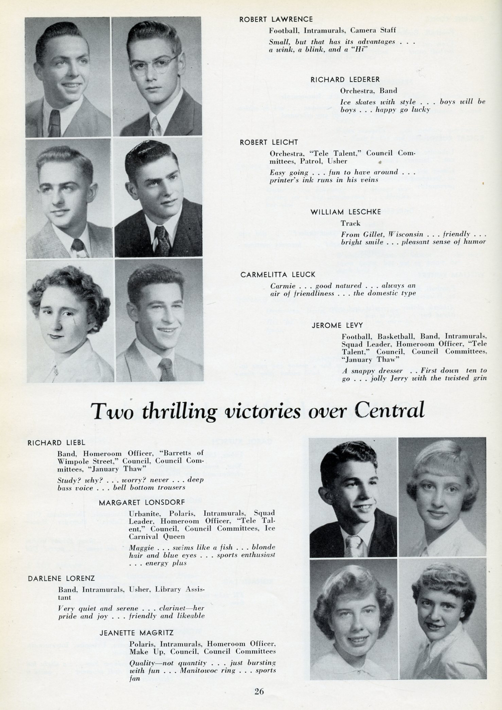 1951 Sheboygan North High School, Page 26: Robert Lawrence, Richard Lederer, Robert Leicht, William Leschke, Carmelitta Leuck, Jerome Levy, Richard Liebl, Margaret Lonsdorf, Darlene Lorenz, Jeanette Magritz.