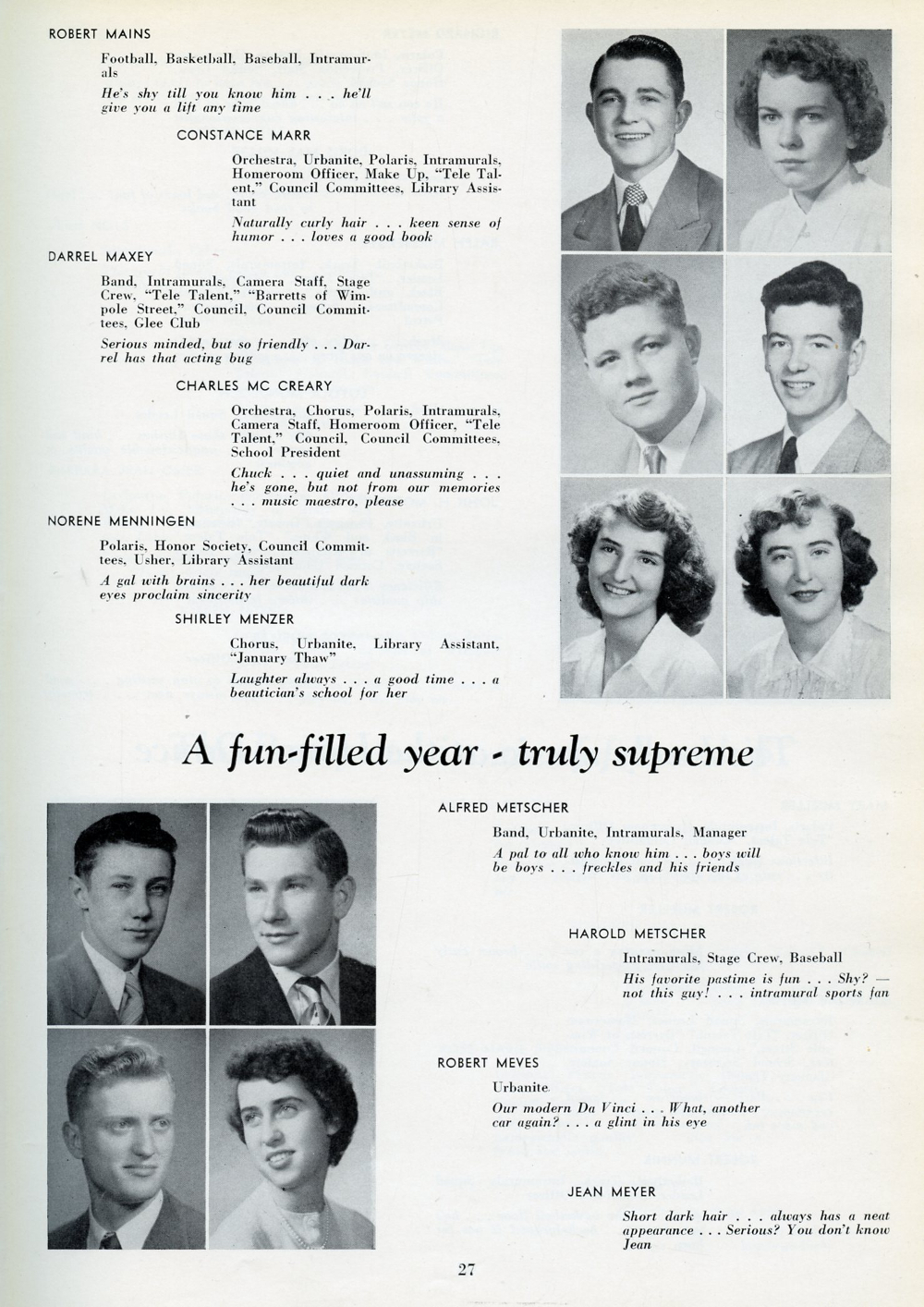 1951 Sheboygan North High School, Page 27: Robert Mains, Constance Marr, Darrel Maxey, Charles Mc Creary, Norene Menningen, Shirley Menzer, Alfred Metscher, Harold Metscher, Robert Meves, Jean Meyer.
