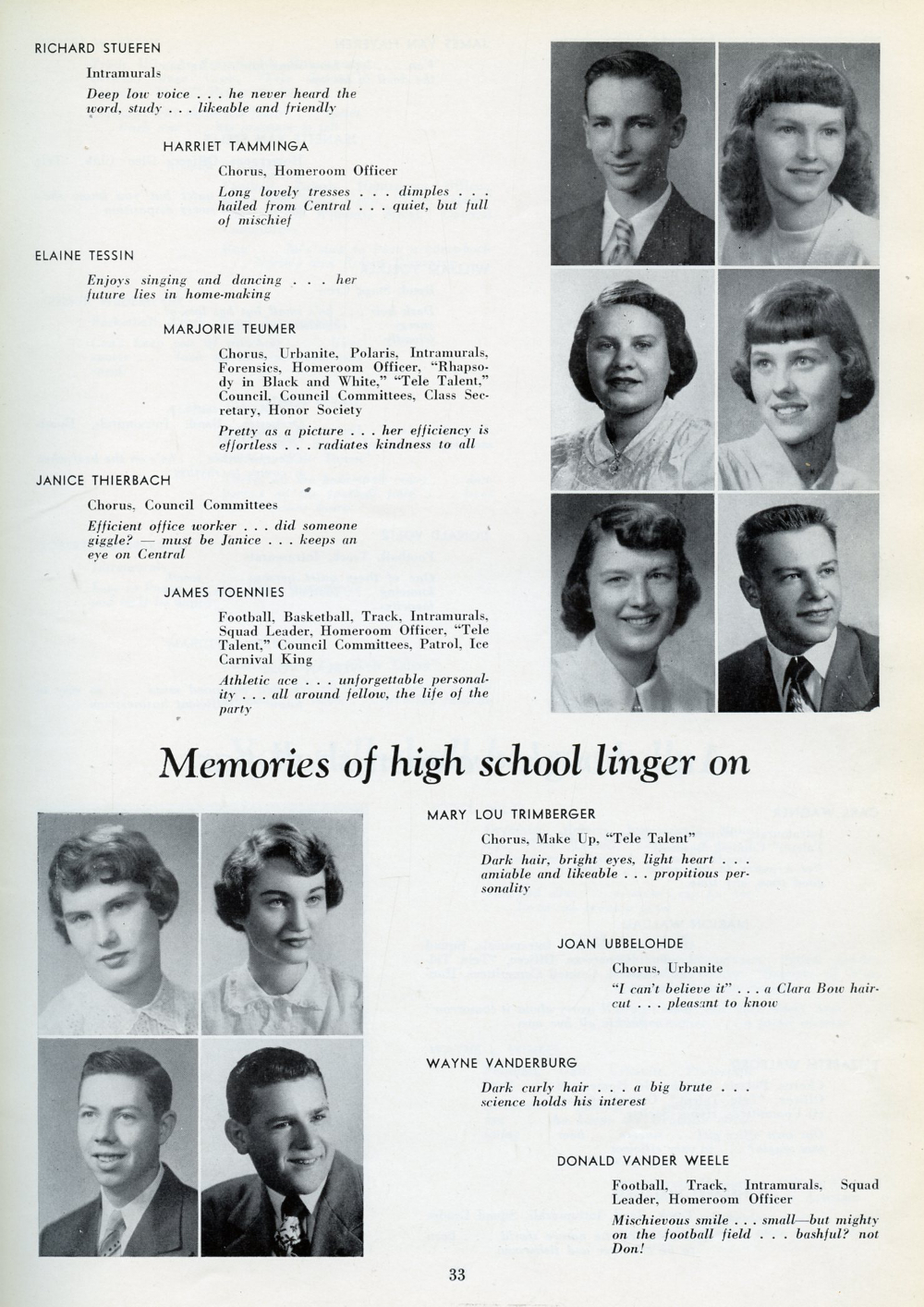 1951 Sheboygan North High School, Page 33: Richard Stuefen, Harriet Tamminga, Elaine Tessin, Marjorie Teumer, Janice Thierbach, James Toennies, Mary Lou Trimberger, Joan Ubbelohde, Wayne Vanderburg, Donald Vander Weele.