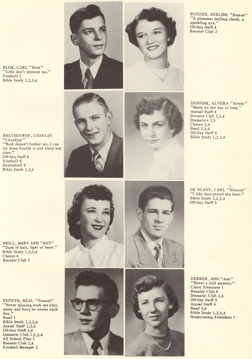 1952 Oostburg High School, Page 1: Adeline Butzen, Carol Blok, Alvera Debbink, Charles Brethouwer, Carol De Blaey, Mary Ann Brill, Ann Dekker, Neal Buteyn.