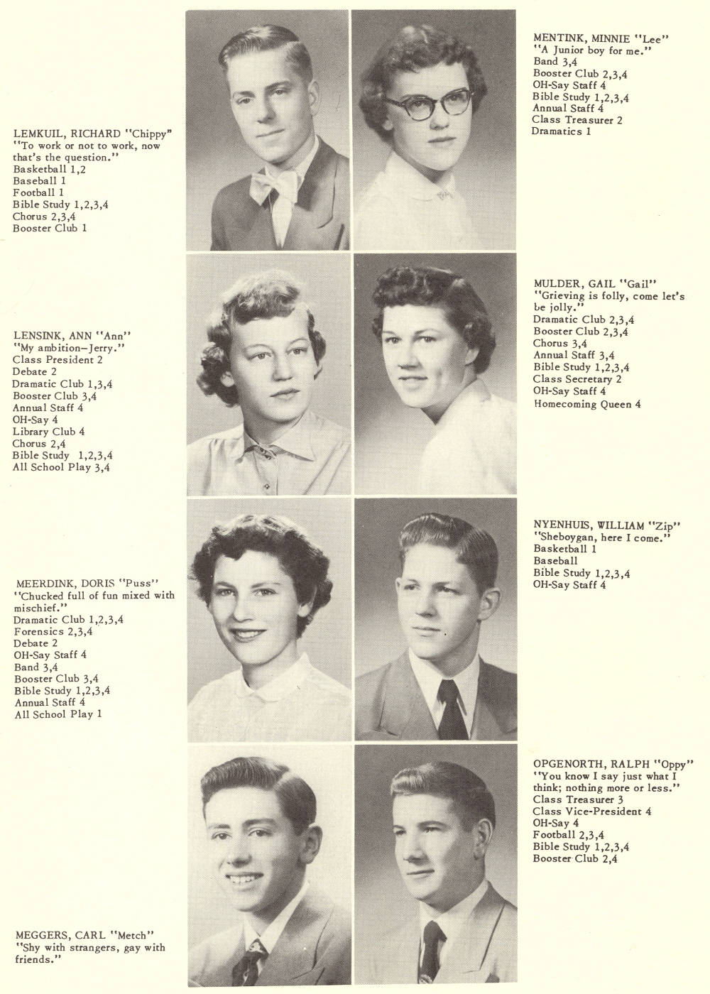 1952 Oostburg High School, Page 4: Richard Lemkuil, Minnie Mentink, Ann Lensink, Gail Mulder, Doris Meerdink, William Nyenhuis, Carl Meggers, Ralph Opgenorth.