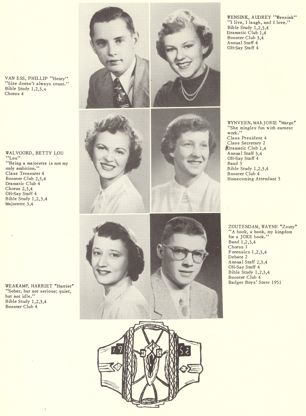 1952 Oostburg High School, Page 6: Phillip Van Ess, Audrey Wensink, Betty Lou Walvoord, Marjorie Wynveen, Harriet Weakamp, Wayne Zoutendam.