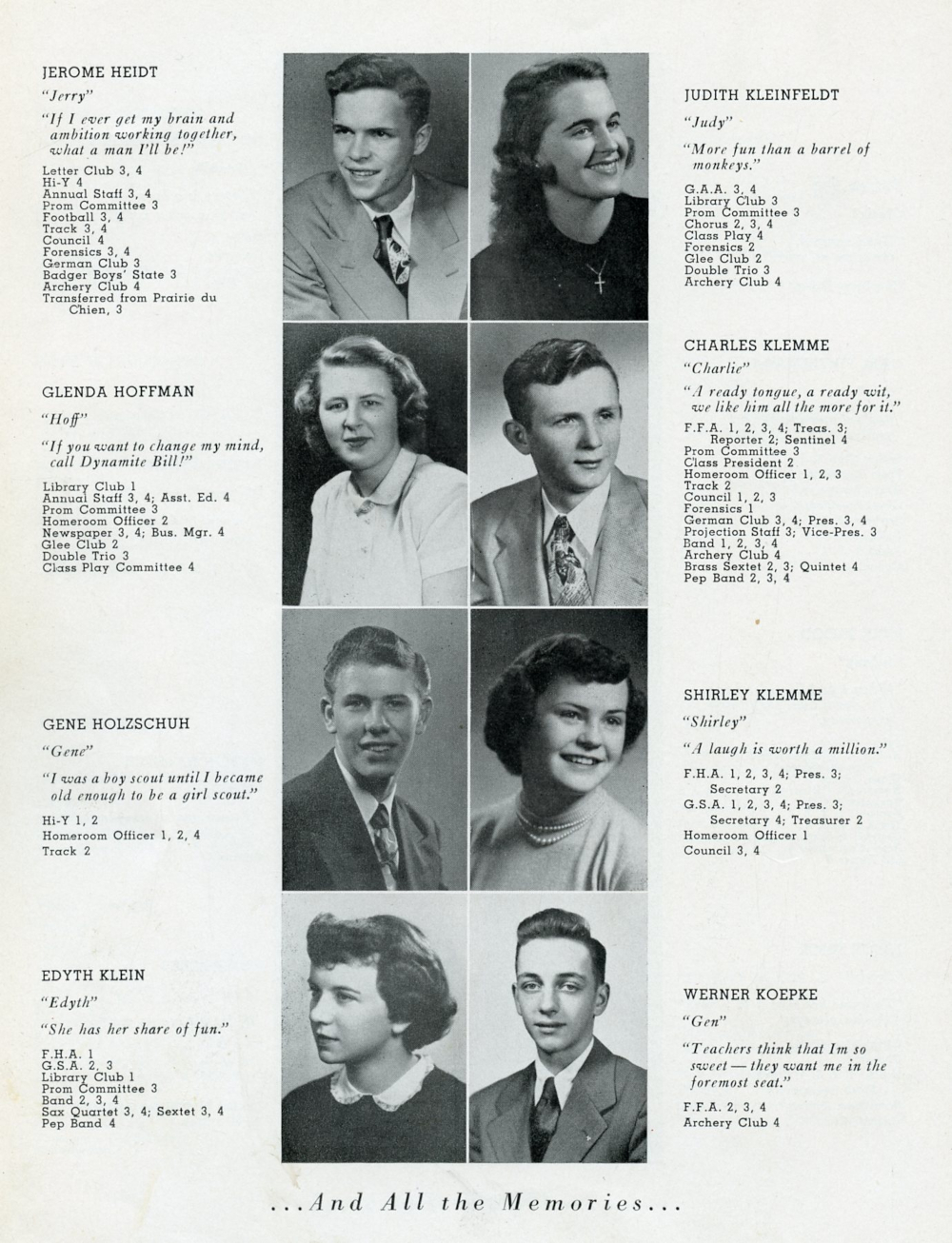 1952 Plymouth High School Yearbook Page 22: Jerome Heidt, Glenda Hoffman, Gene Holzschuh, Edyth Klein, Judith Kleinfeldt, Charles Klemme, Shirley Klemme, Werner Koepke.