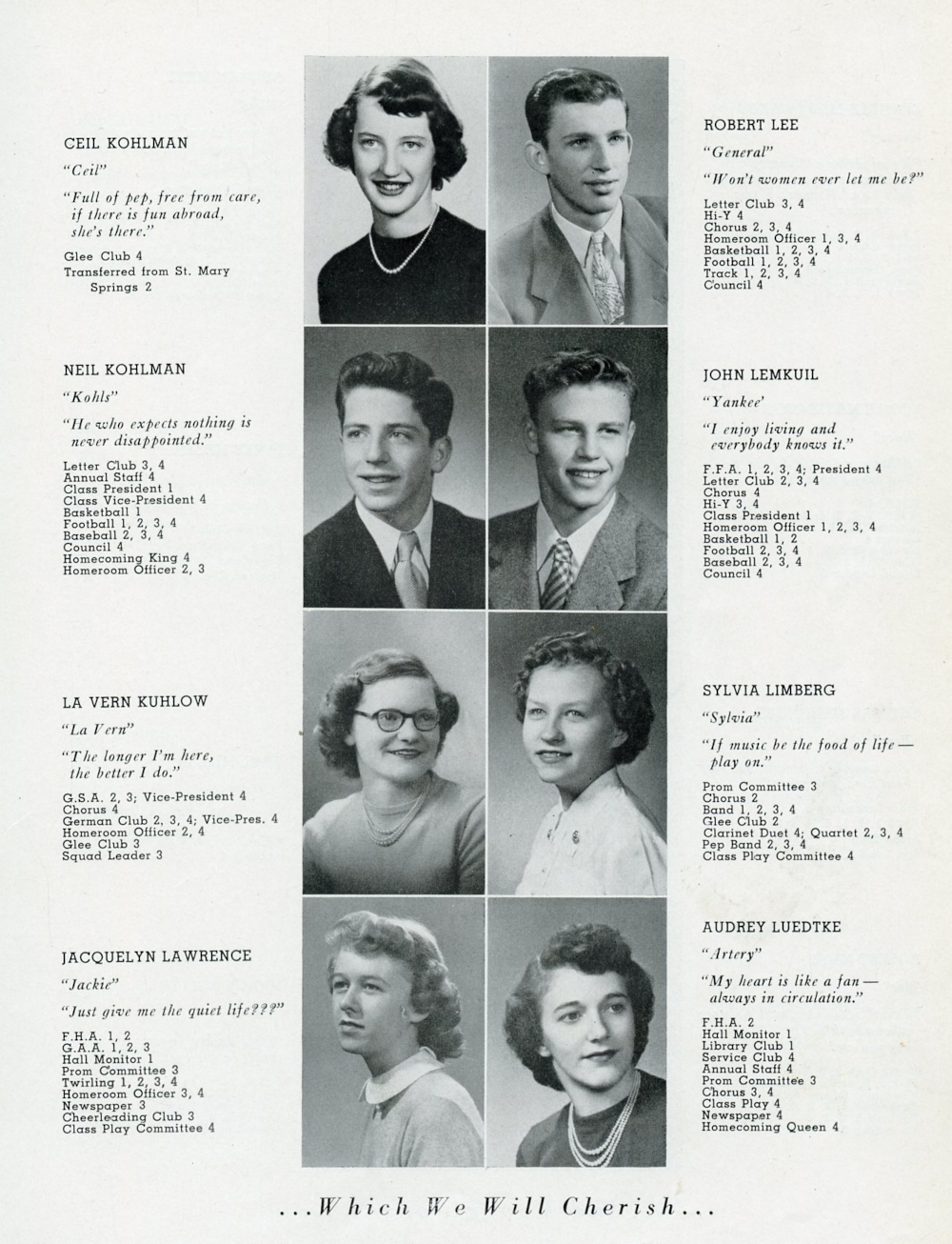 1952 Plymouth High School Yearbook Page 23: Ceil Kohlman, Neil Kohlman, La Vern Kuhlow, Jacquelyn Lawrence, Robert Lee, John Lemkuil, Sylvia Limberg, Audrey Luedtke.