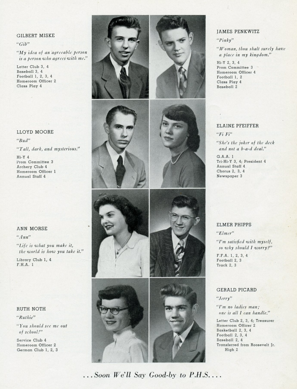 1952 Plymouth High School Yearbook Page 25: Gilbert Miske, Lloyd Moore, Ann Morse, Ruth Noth, James Penkwitz, Elaine Pfeiffer, Elmer Phipps, Gerald Picard.
