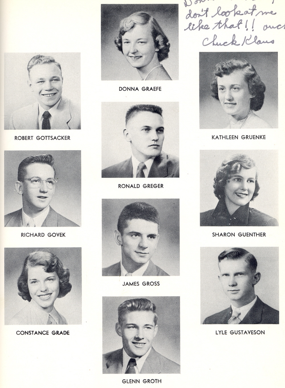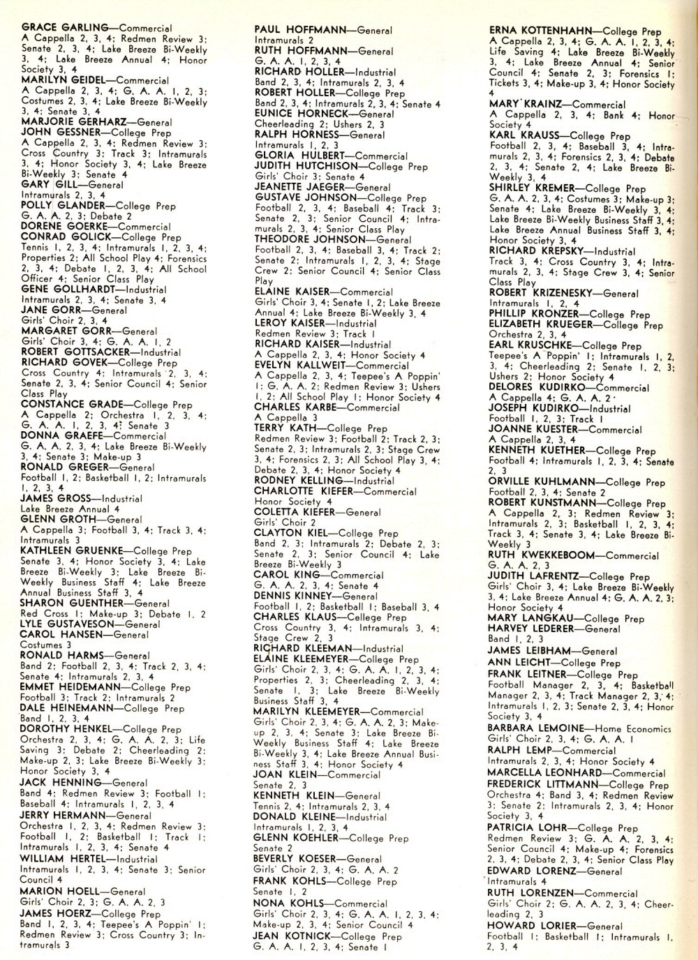 1952 Sheboygan Central High School, Page 101: Robert Gottsacker, Richard Govek, Constance Grade, Donna Graefe, Ronald Greger, James Gross, Glenn Groth, Kathleen Gruenke, Sharon Guenther, Lyle Gustaveson.