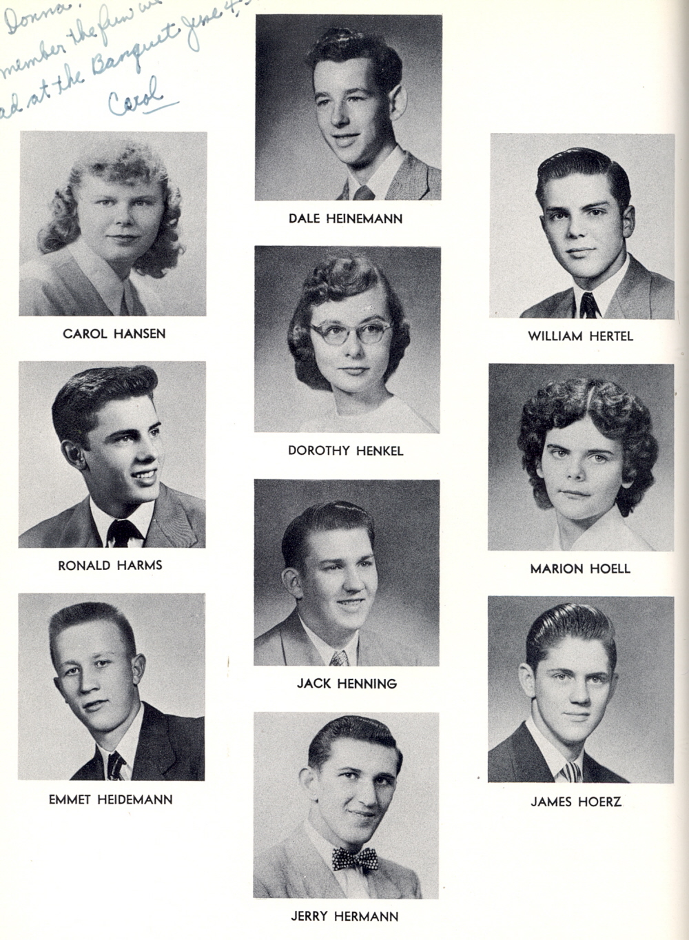 1952 Sheboygan Central High School, Page 102: Carol Hansen, Ronald Harms, Emmet Heidemann, Dale Heinemann, Dorothy Henkel, Jack Henning, Jerry Hermann, William Hertel, Marion Hoell, James Hoerz.