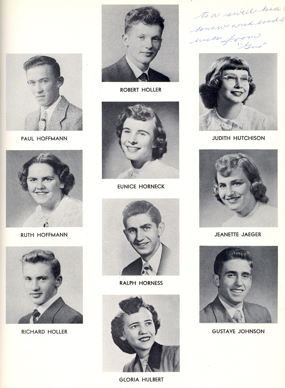 1952 Sheboygan Central High School, Page 103: Paul Hoffmann, Ruth Hoffmann, Richard Holler, Robert Holler, Eunice Horneck, Ralph Horness, Gloria Hulbert, Judith Hutchison, Jeanette Jaeger, Gustave Johnson.