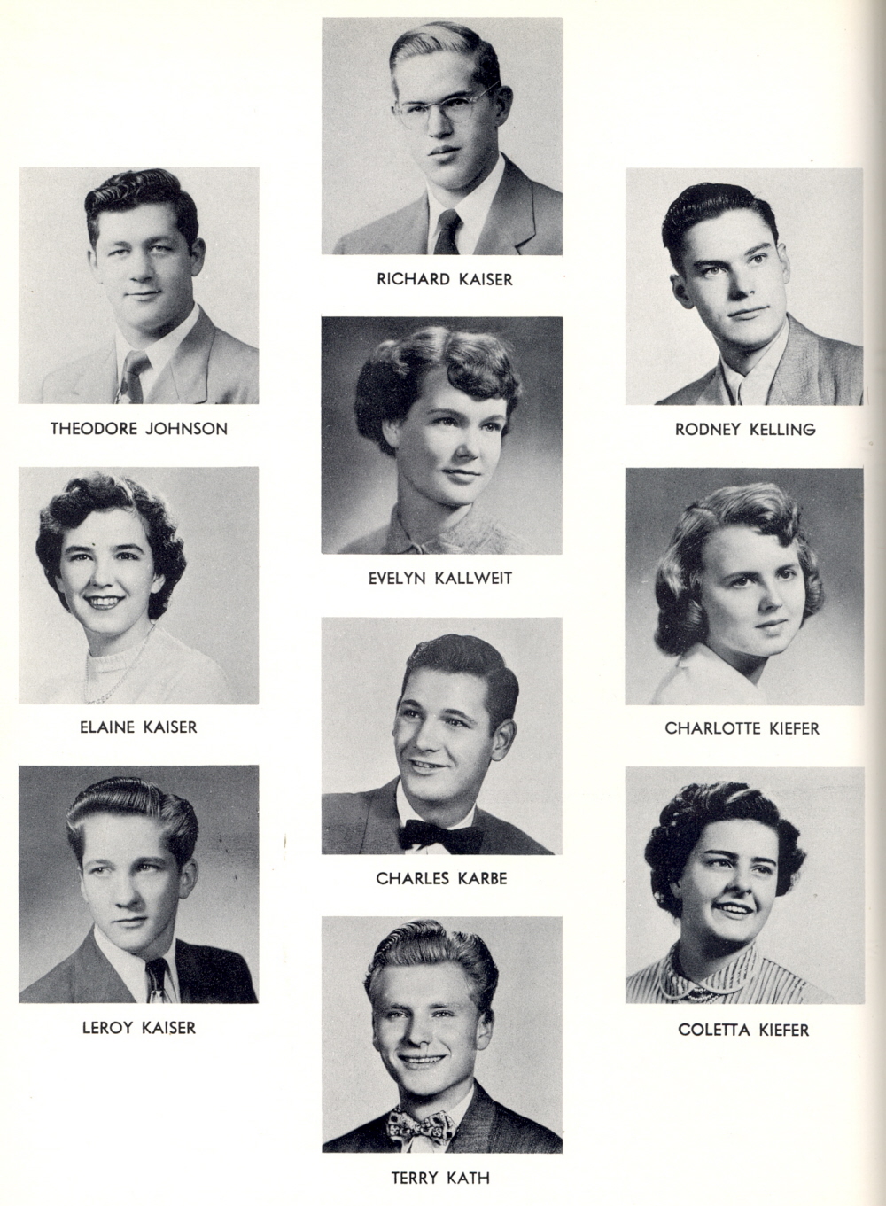 1952 Sheboygan Central High School, Page 104: Theodore Johnson, Elaine Kaiser, Leroy Kaiser, Richard Kaiser, Evelyn Kallweit, Charles Karbe, Terry Kath, Rodney Kelling, Charlotte Kiefer, Coletta Kiefer.