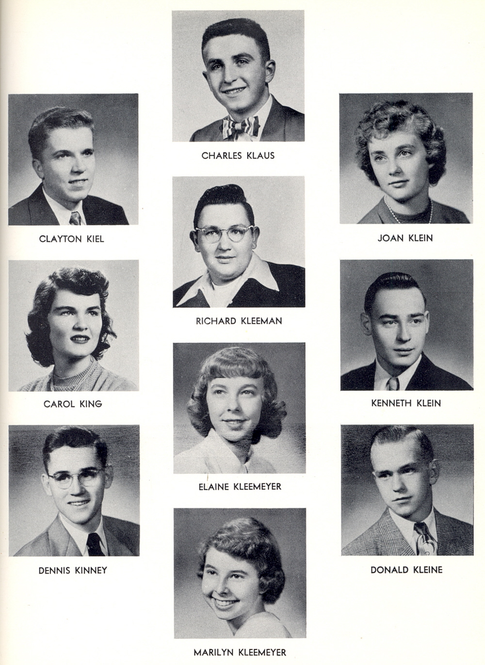 1952 Sheboygan Central High School, Page 105: Clayton Kiel, Carol King, Dennis Kinney, Charles Klaus, Richard Kleeman, Elaine Kleemeyer, Marilyn Kleemeyer, Joan Klein, Kenneth Klein, Donald Kleine.