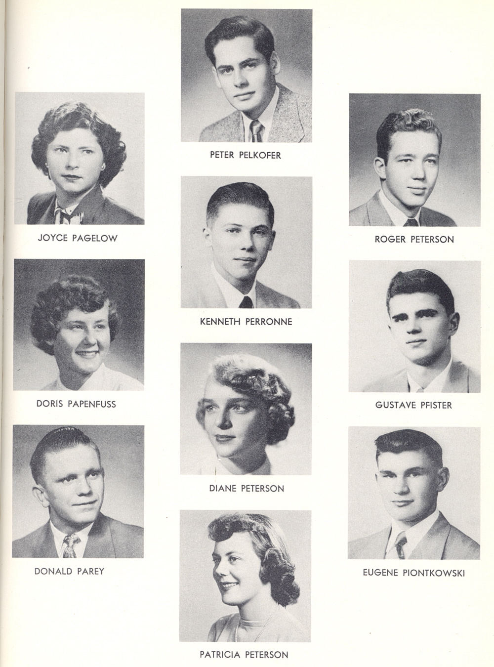 1952 Sheboygan Central High School, Page 113: Joyce Pagelow, Doris Papenfuss, Donald Parey, Peter Pelkofer, Kenneth Perronne, Diane Peterson, Patricia Peterson, Roger Peterson, Gustave Pfister, Eugene Piontkowski.