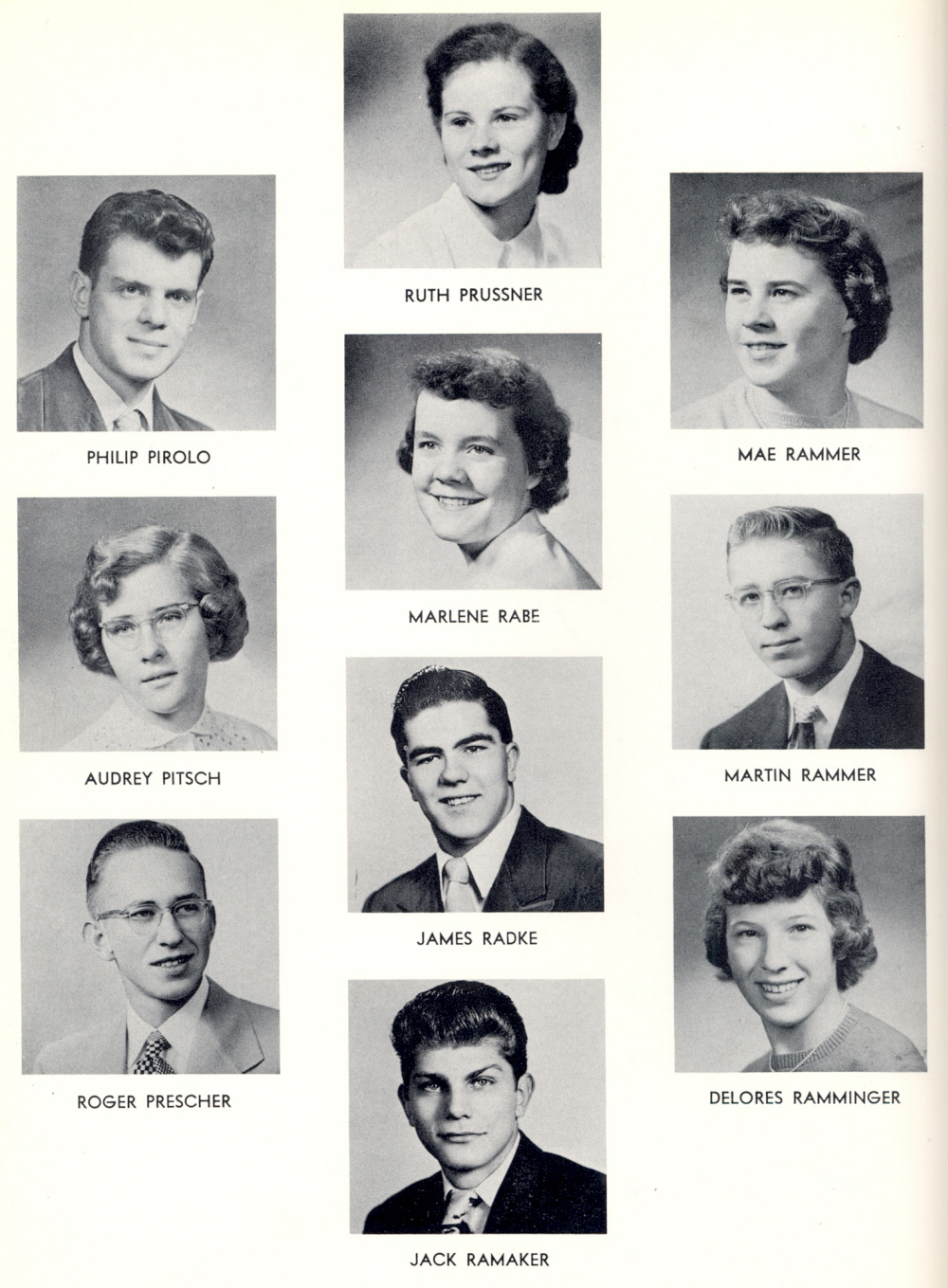 1952 Sheboygan Central High School, Page 114: Philip Pirolo, Audrey Pitsch, Roger Prescher, Ruth Prussner, Marlene Rabe, James Radke, Jack Ramaker, Mae Rammer, Martin Rammer, Delores Ramminger.