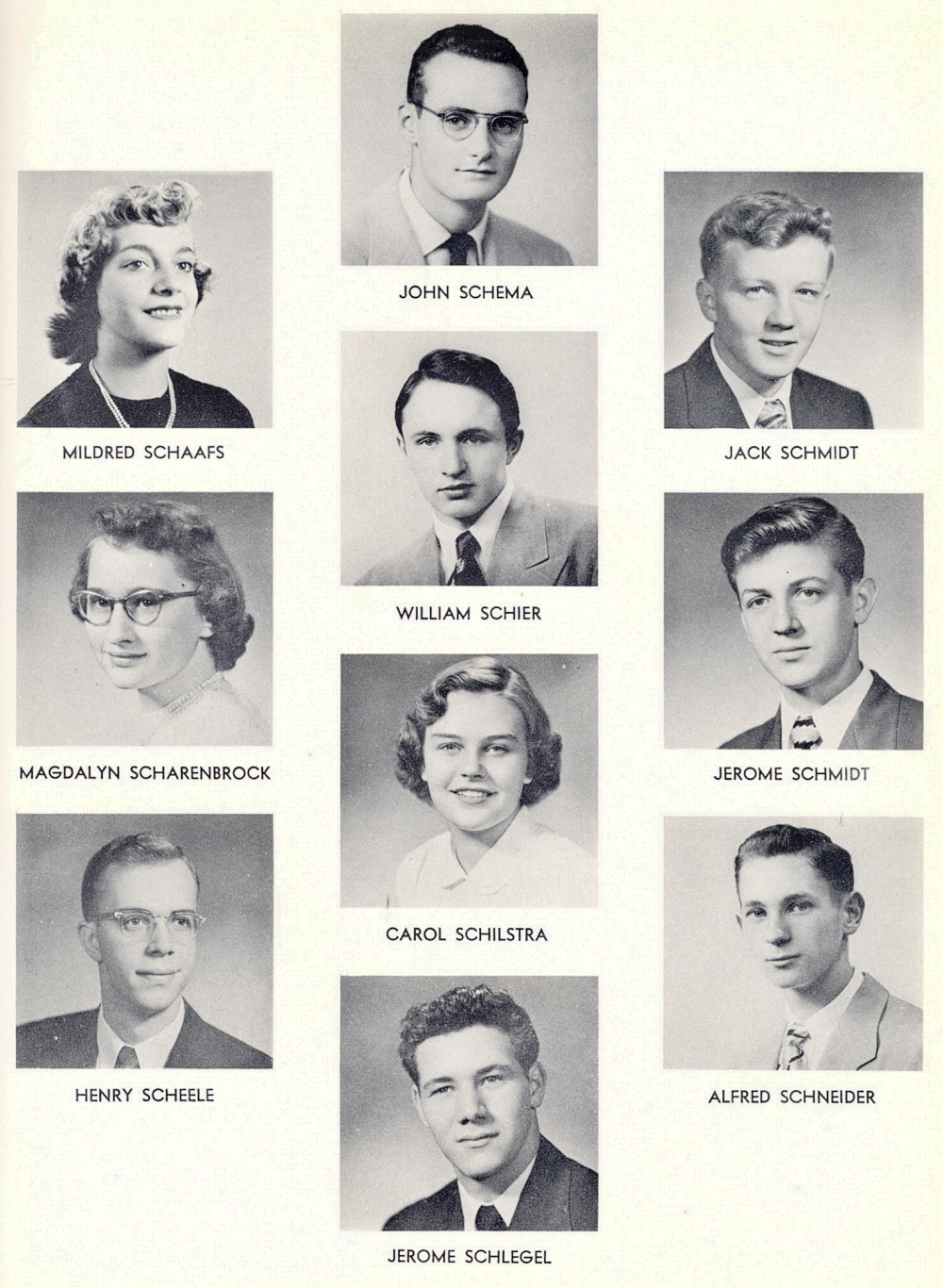 1952 Sheboygan Central High School, Page 117: Mildred Schaafs, Magdalyn Scharenbrock, Henry Scheele, John Schema, William Schier, Carol Schilstra, Jerome Schlegel, Jack Schmidt, Jerome Schmidt, Alfred Schneider.