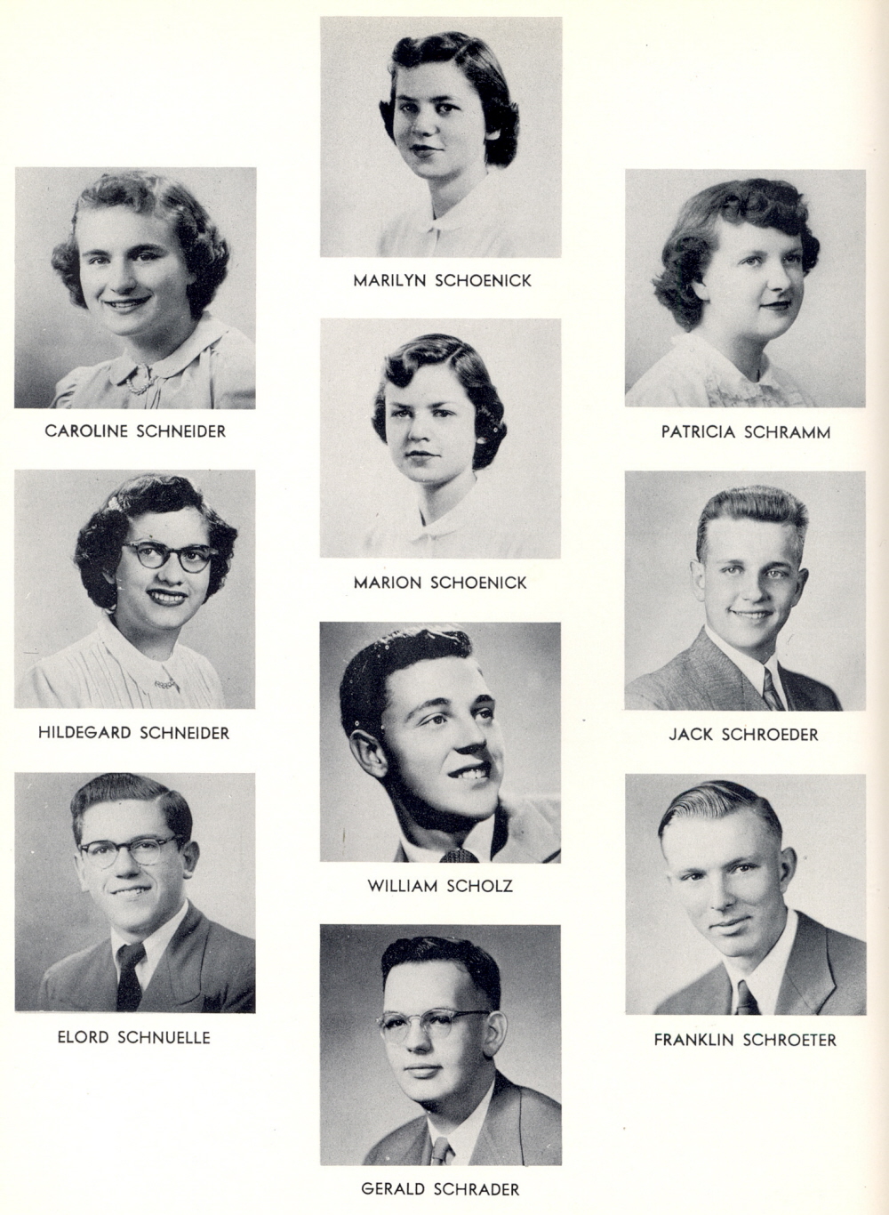 1952 Sheboygan Central High School, Page 118: Caroline Schneider, Hildegard Schneider, Elord Schnuelle, Marilyn Schoenick, Marion Schoenick, William Schotz, Gerald Schrader, Patricia Schramm, Jack Schroeder, Franklin Schroeter.