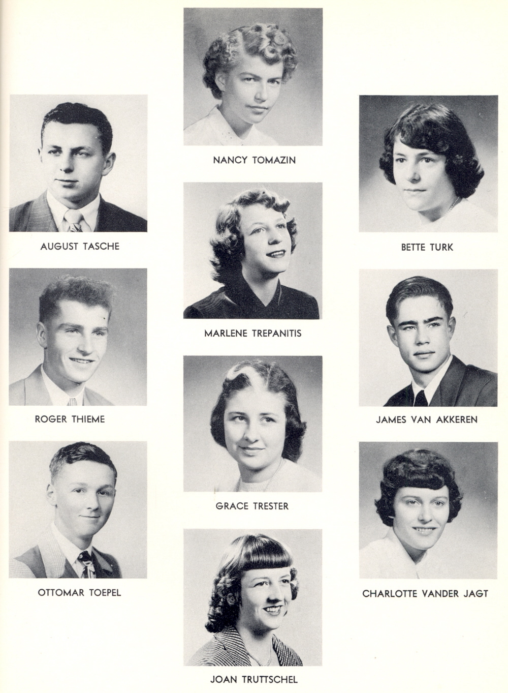 1952 Sheboygan Central High School, Page 121: August Tasche, Roger Thieme, Ottomar Toepel, Nancy Tomazin, Marlene Trepanitis, Grace Trester, Joan Truttschel, Bette Turk, James Van Akkeren, Charlotte Vander Jagt.