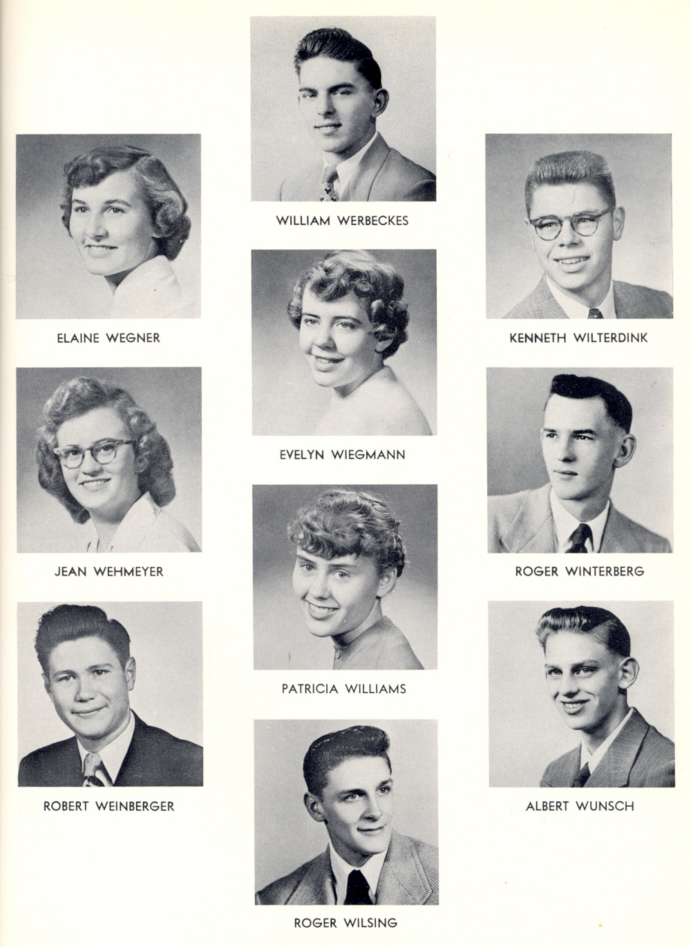 1952 Sheboygan Central High School, Page 123: Elaine Wegner, Jean Wehmeyer, Robert Weinberger, William Werbeckes, Evelyn Wiegmann, Patricia Williams, Roger Wilsing, Kenneth Wilterdink, Roger Winterberg, Albert Wunsch.