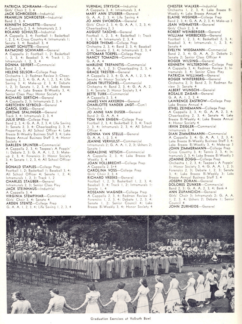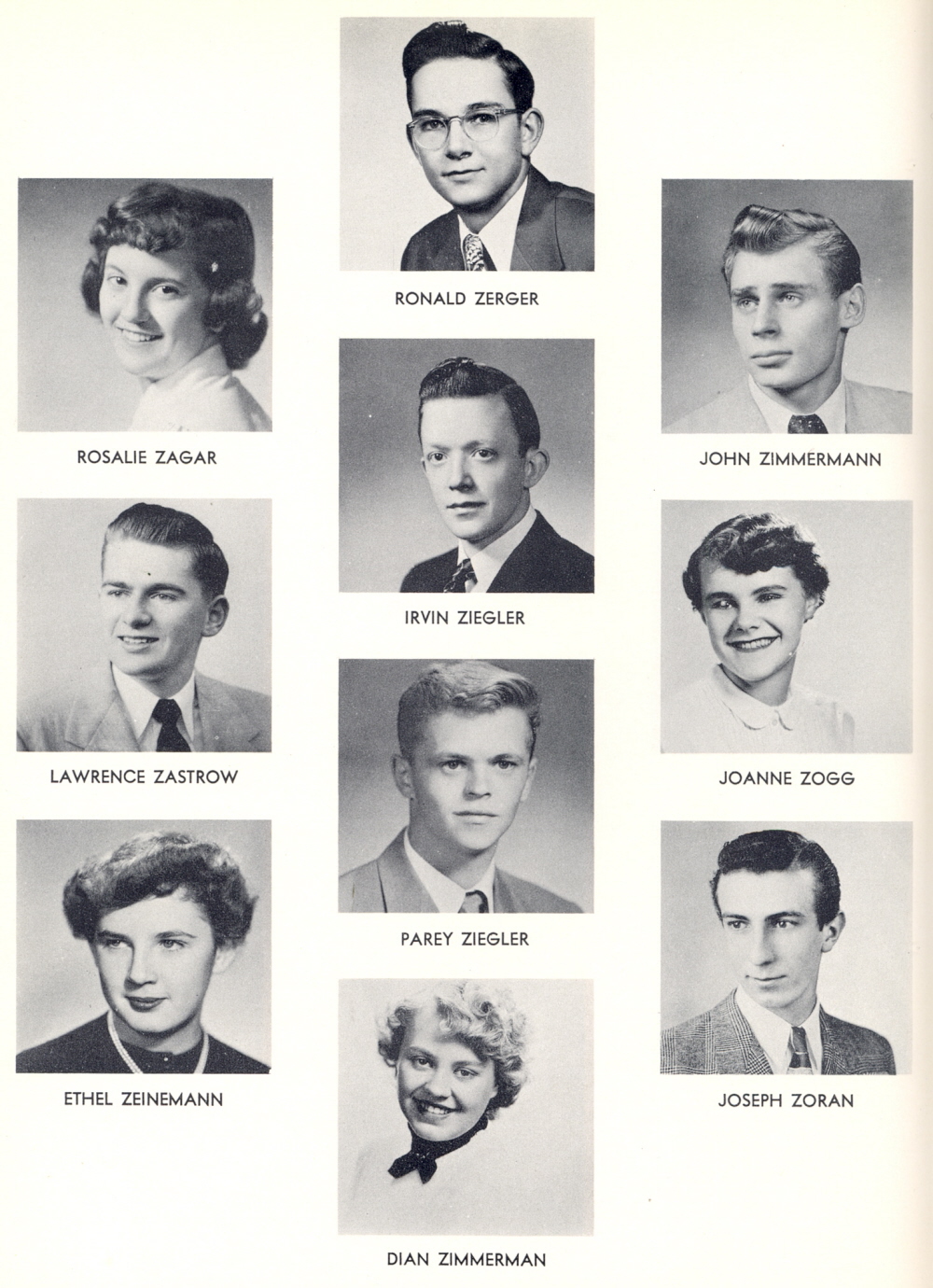 1952 Sheboygan Central High School, Page 124: Rosalie Zagar, Lawrence Zastrow, Ethel Zeinemann, Ronald Zerger, Irvin Ziegler, Parey Ziegler, Dian Zimmerman, John Zimmermann, Joanne Zogg, Joseph Zoran.