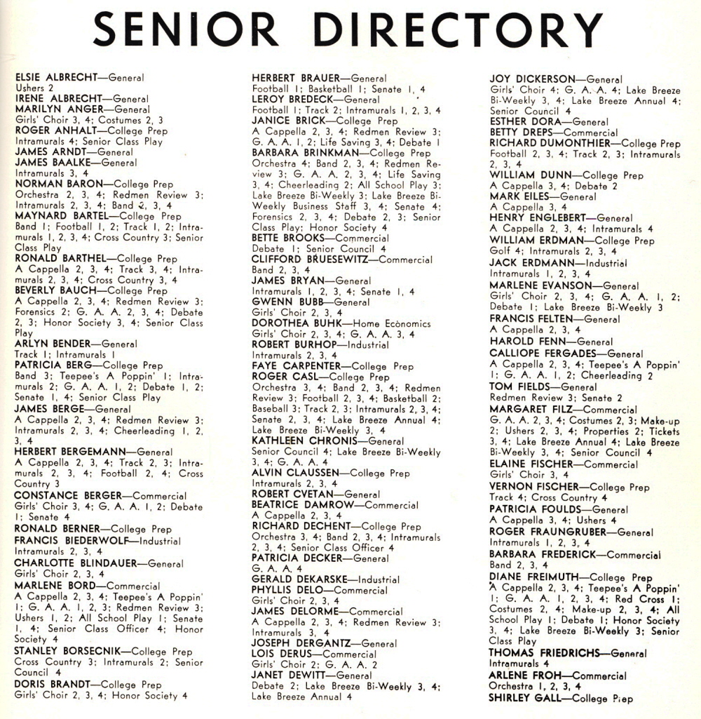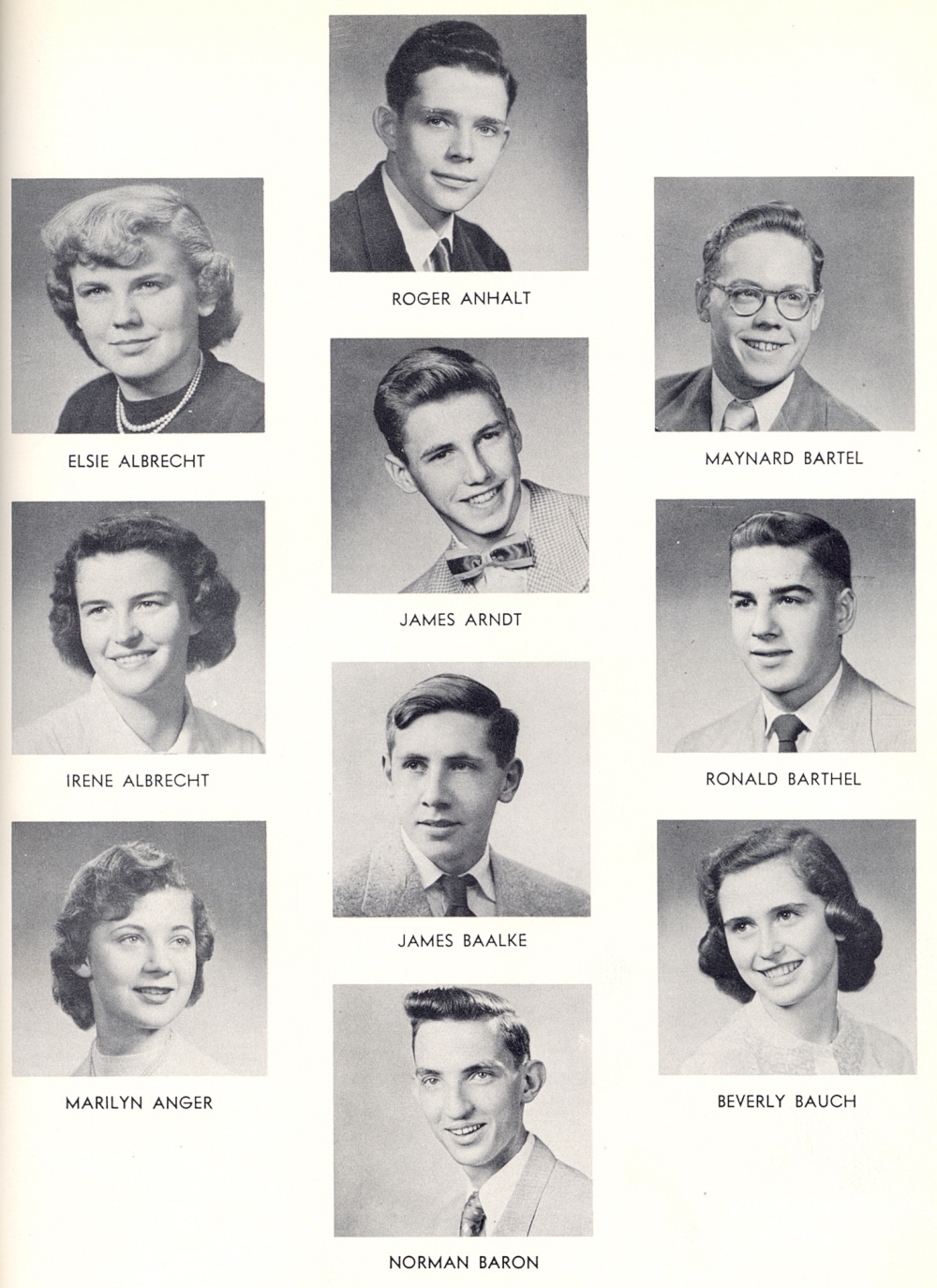 1952 Sheboygan Central High School, Page 93: Elsie Albrecht, Irene Albrecht, Marilyn Anger, Roger Anhalt, James Arndt, James Baalke, Norman Baron, Maynard Bartel, Ronald Barthel, Beverly Bauch.
