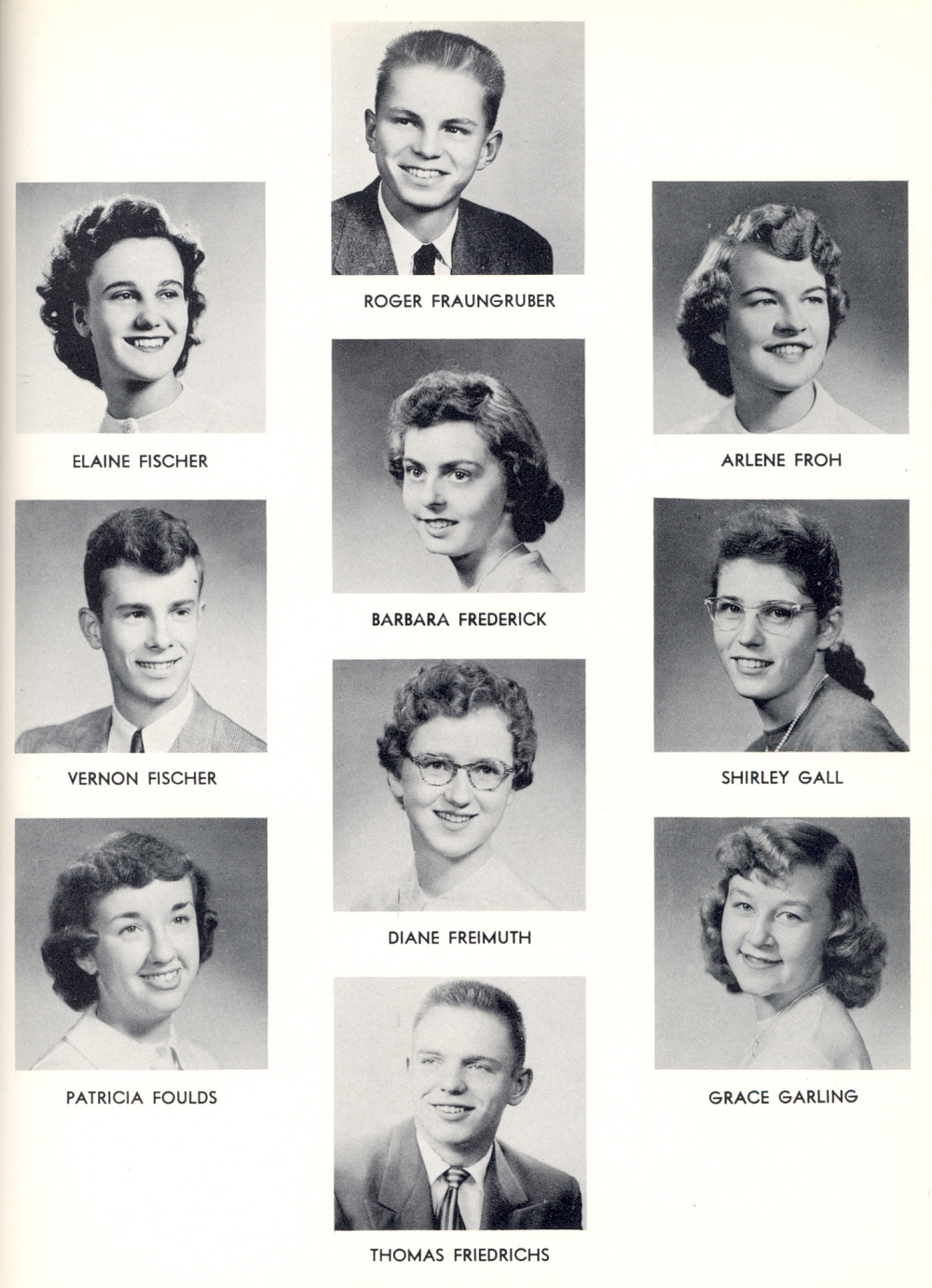 1952 Sheboygan Central High School, Page 99: Elaine Fischer, Vernon Fischer, Patricia Foulds, Roger Fraungruber, Barbara Frederick, Diane Freimuth, Thomas Friedrichs, Arlene Froh, Shirley Gall, Grace Garling.