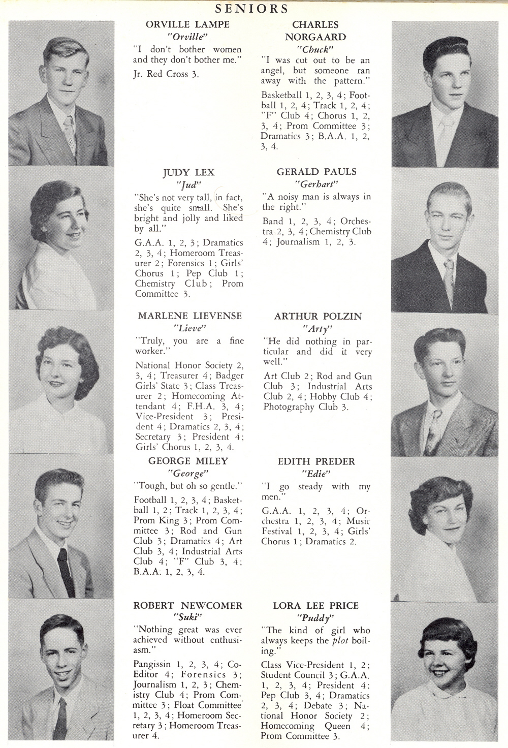 1952 Sheboygan Falls High School, Page 19: Orville Lampe, Charles Norgaard, Judy Lex, Gerald Pauls, Marlene Lievense, Arthur Polzin, George Miley, Edith Preder, Robert Newcomer, Lora Lee Price.