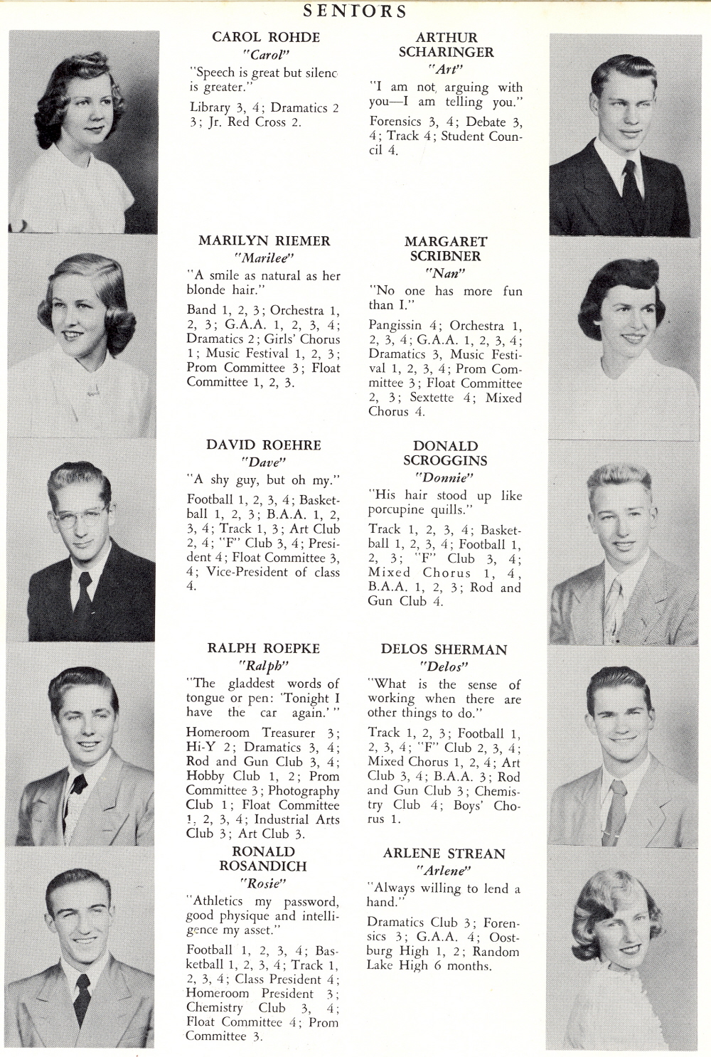 1952 Sheboygan Falls High School, Page 20: Carol Rohde, Arthur Scharinger, Marilyn Riemer, Margaret Scribner, David Roehre, Donald Scroggins, Ralph Roepke, Delos Sherman, Ronald Rosandich, Arlene Strean.