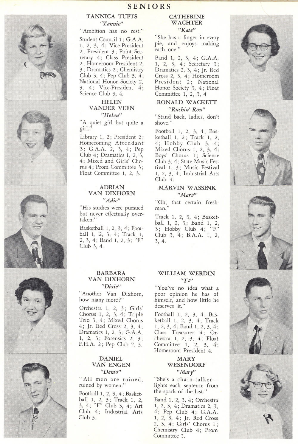 1952 Sheboygan Falls High School, Page 21: Tannica Tufts, Catherine Wachter, Helen Vander Veen, Ronald Wackett, Adrian Van Dixhorn, Marvin Wassink, Barbara Van Dixhorn, William Werdin, Daniel Van Engen, Mary Wesendorf.