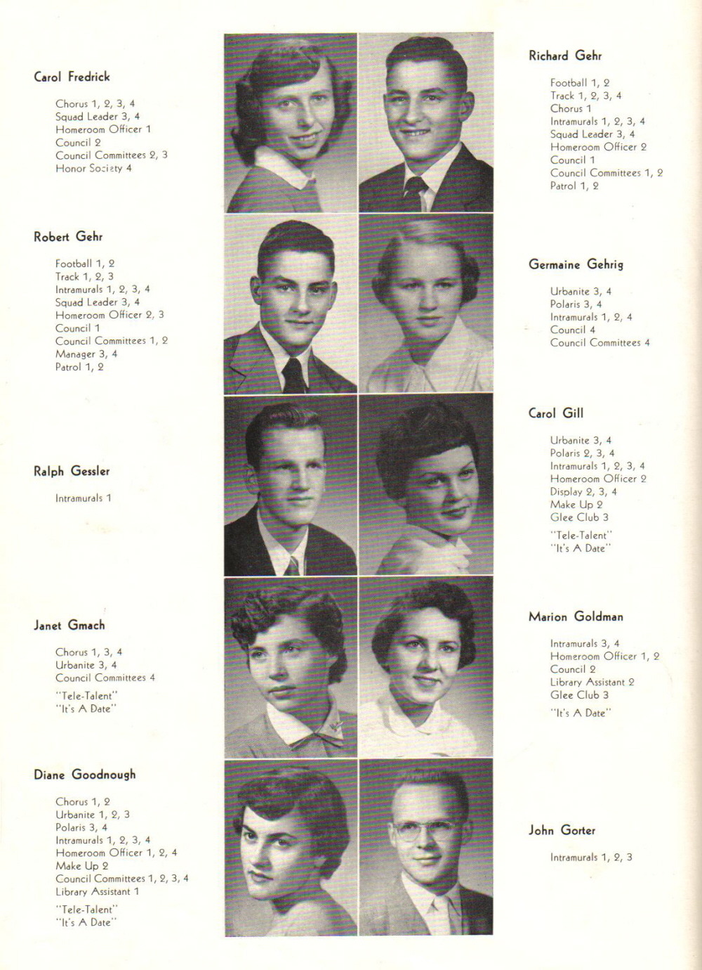 1952 Sheboygan North High School, Page 34: Carol Fredrick, Richard Gehr, Robert Gehr, Germaine Gehrig, Ralph Gessler, Carol Gill, Janet Gmach, Marion Goldman, Diane Goodnough, John Gorter.