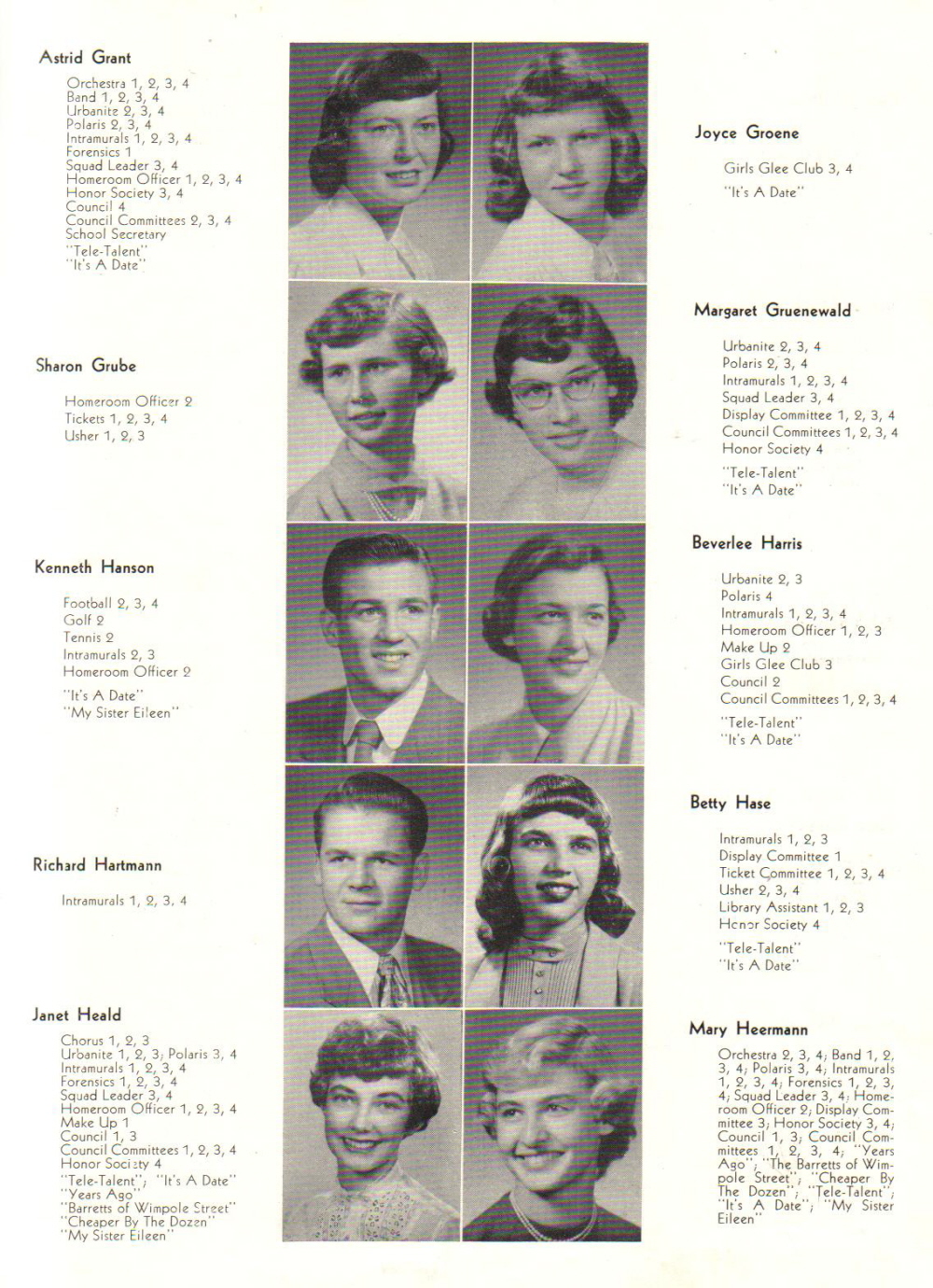 1952 Sheboygan North High School, Page 35: Astrid Grant, Joyce Groene, Sharon Grube, Margaret Gruenewald, Kenneth Hanson, Beverlee Harris, Richard Hartmann, Betty Hase, Janet Heald, Mary Heermann.