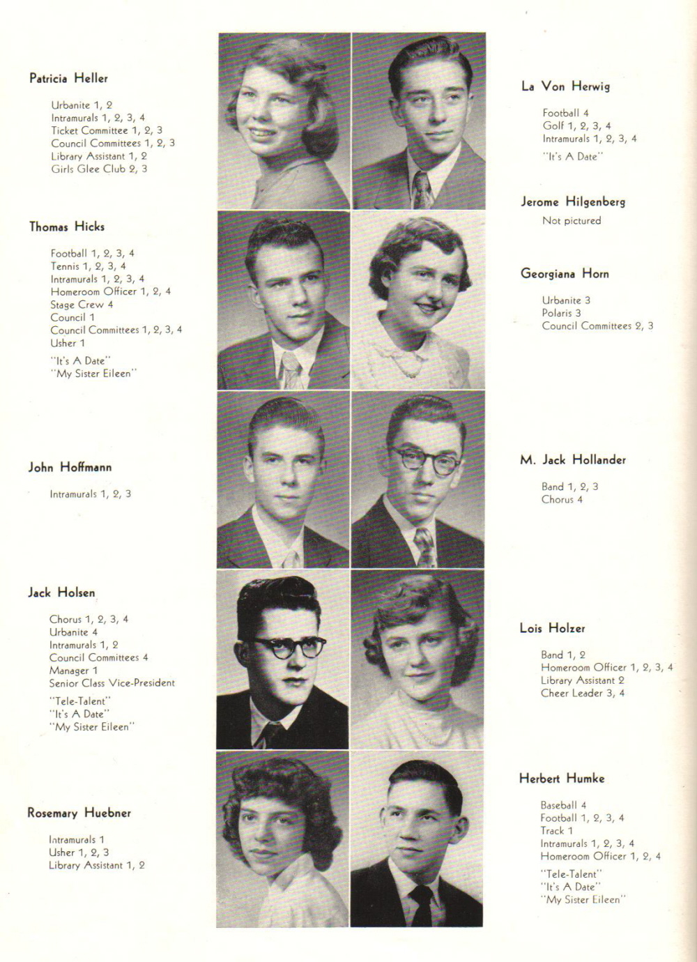 1952 Sheboygan North High School, Page 36: Patricia Heller, La Von Herwig, Thomas Hicks, Gerome Hilgenberg, Georgiana Horn, John Hoffmann, M. Jack Hollander, Jack Holsen, Lois Holzer, Rosemary Huebner, Herbert Humke.