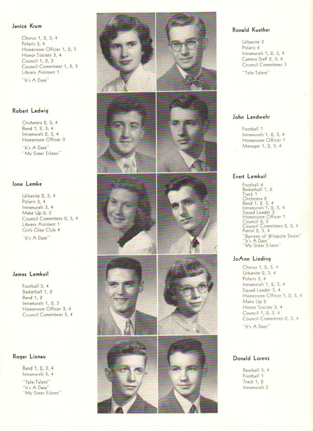 1952 Sheboygan North High School, Page 38: Janice Krum, Ronald Kuether, Robert Ladwig, John Landwehr, Ione Lemke, Evert Lemkuil, James Lemkuil, JoAnn Lieding, Roger Lienau, Donald Lorenz.