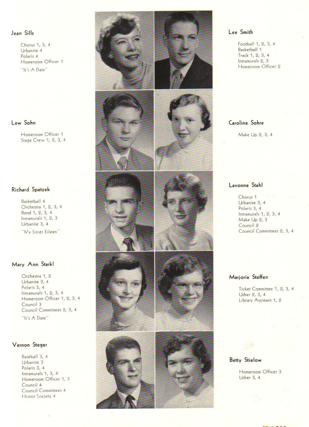 1952 Sheboygan North High School, Page 45: Jean Sills, Lee Smith, Lew Sohn, Caroline Sohre, Richard Spatzek, Lavonne Stahl, Mary Ann Starkl, Marjorie Steffen, Vernon Steger, Betty Stielow.
