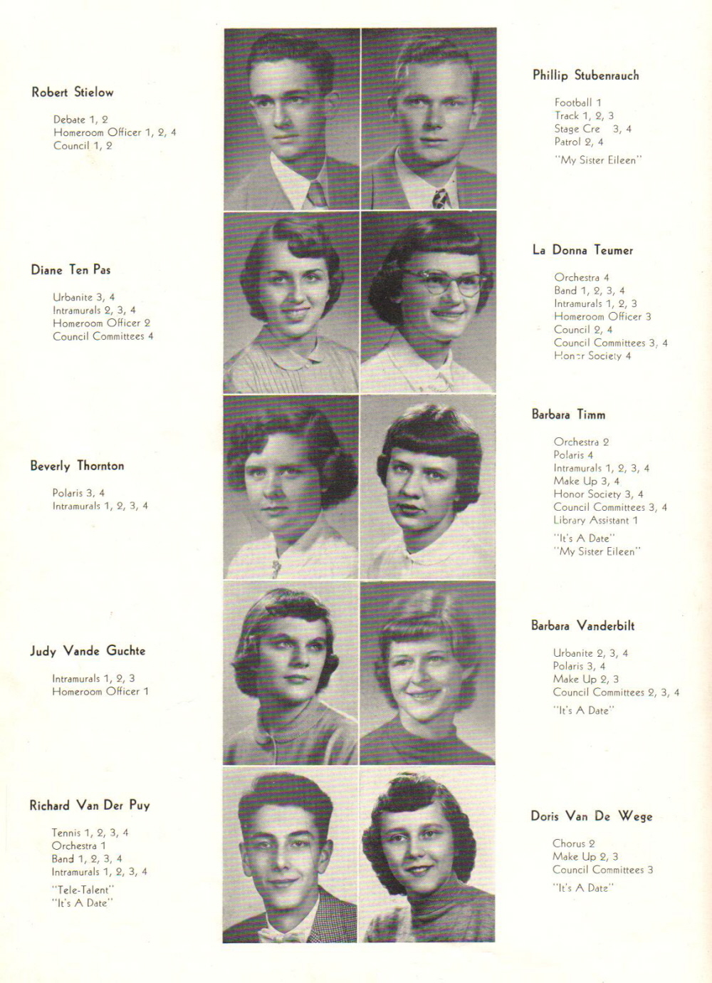 1952 Sheboygan North High School, Page 46: Robert Stielow, Phillip Stubenrauch, Diane Ten Pas, La Donna Teumer, Beverly Thornton, Barbara Timm, Judy Vande Guchte, Barbara Vanderbilt, Richard Van Der Puy, Doris Van De Wege.