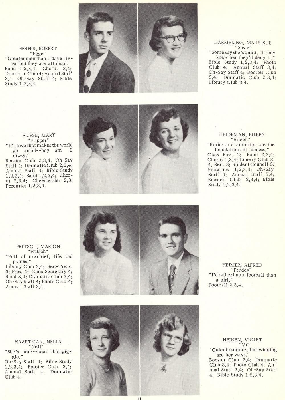 1953 Oostburg High School, Page 11: Robert Ebbers, Mary Sue Harmeling, Mary Flipse, Eileen Heideman, Marion Fritsch, Alfred Heimer, Nella Haartman, Violet Heinen.