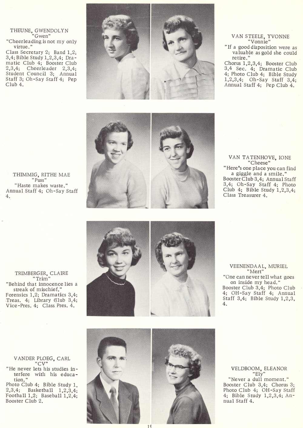 1953 Oostburg High School, Page 15: Gwendolyn Theune, Yvonne Van Steele, Rithe Mae Thimmig, Ione Van Tatenhove, Claire Trimberger, Muriel Veenendaal, Carl Vander Ploeg, Eleanor Veldboom.