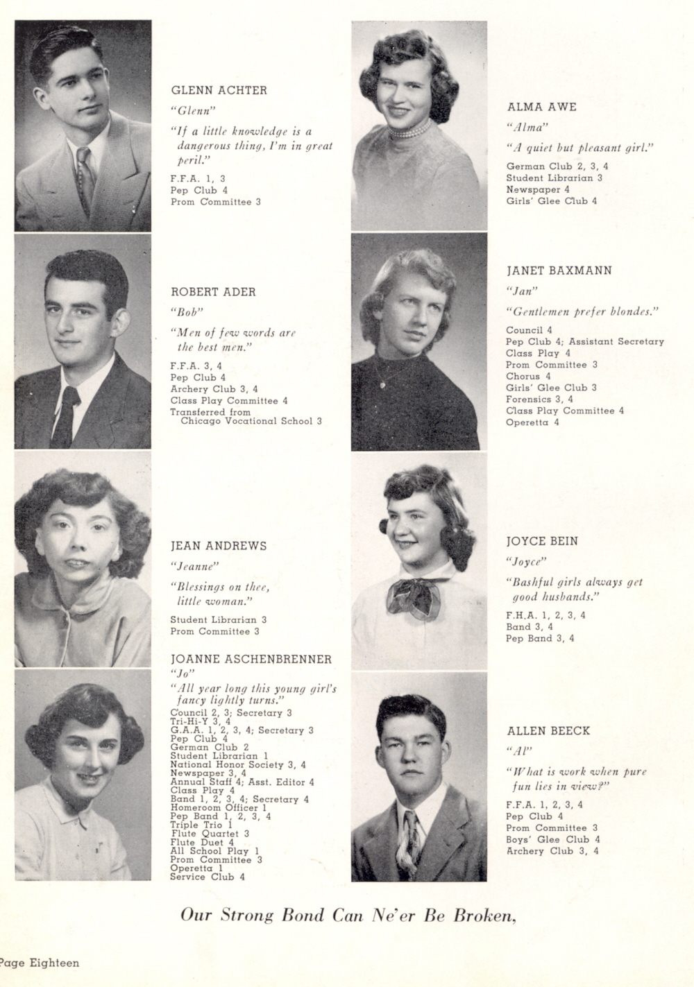 1953 Plymouth High School, Page 18: Glenn Achter, Robert Ader, Jean Andrews, Joanne Aschenbrenner, Alma Awe, Janet Baxmann, Allen Beeck, Joyce Bein.