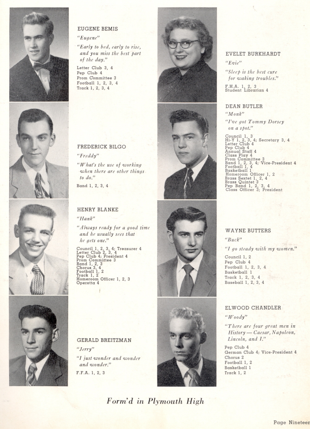 1953 Plymouth High School, Page 19: Eugene Bemis, Frederick Bilgo, Henry Blanke, Gerald Breitzman, Evelet Burkhardt, Dean Butler, Wayne Butters, Elwood Chandler.
