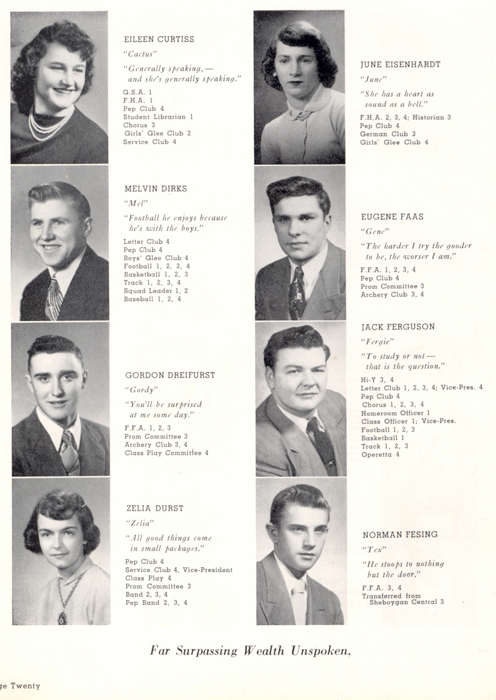 1953 Plymouth High School, Page 20: Eileen Curtiss, Melvin Dirks, Gordon Dreifurst, Zelia Durst, June Eisenhardt, Eugene Faas, Jack Ferguson, Norman Fesing.