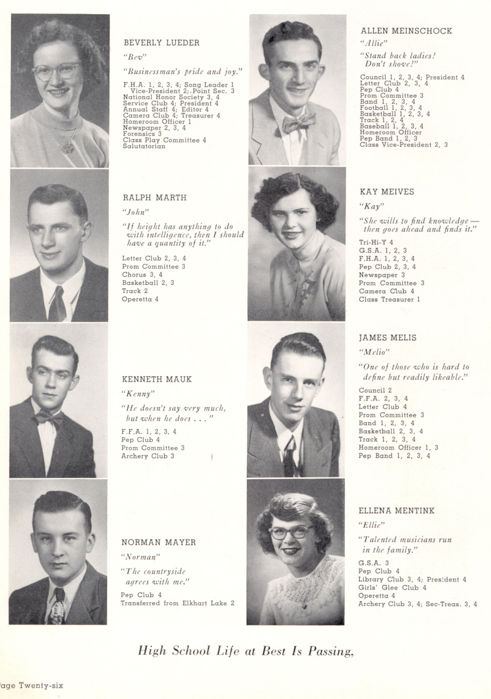 1953 Plymouth High School, Page 26: Beverly Lueder, Ralph Marth, Kenneth Mauk, Norman Mayer, Allen Meinschock, Kay Meives, James Melis, Ellena Mentink.