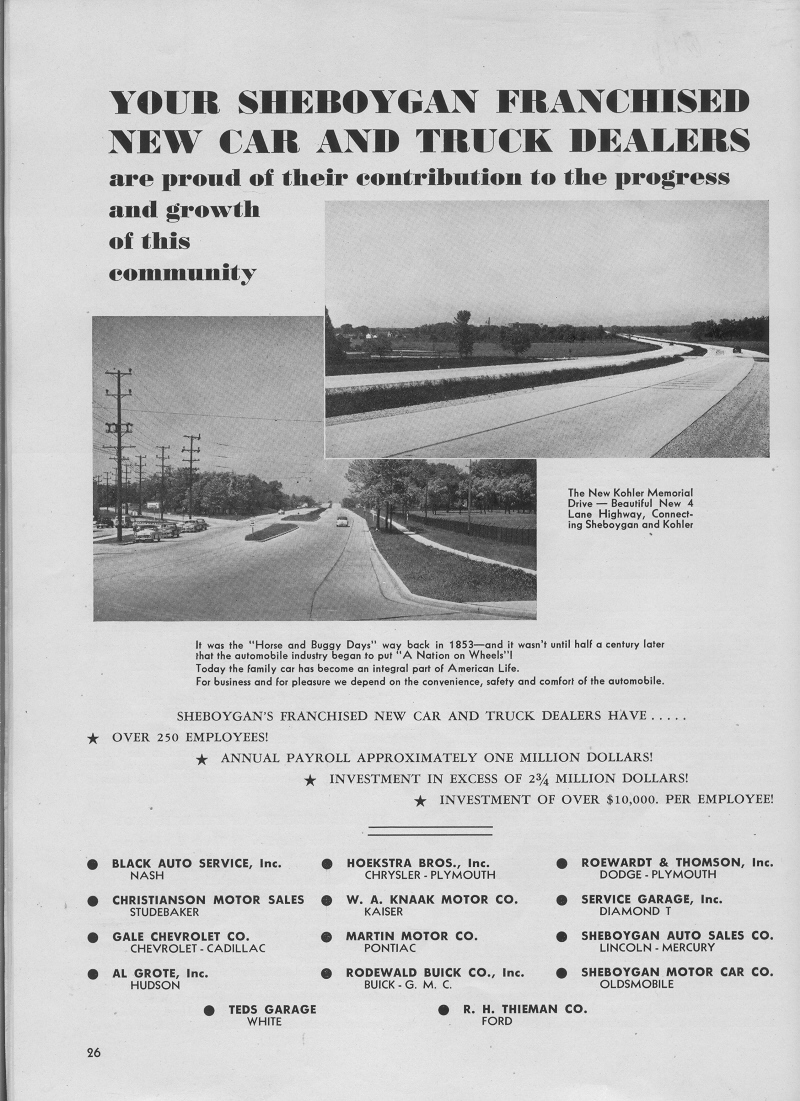 1953 Sheboygan Centennial Celebration, Page 26, Ad from Your Sheboygan Franchised New Car and Truck Dealers (photos):