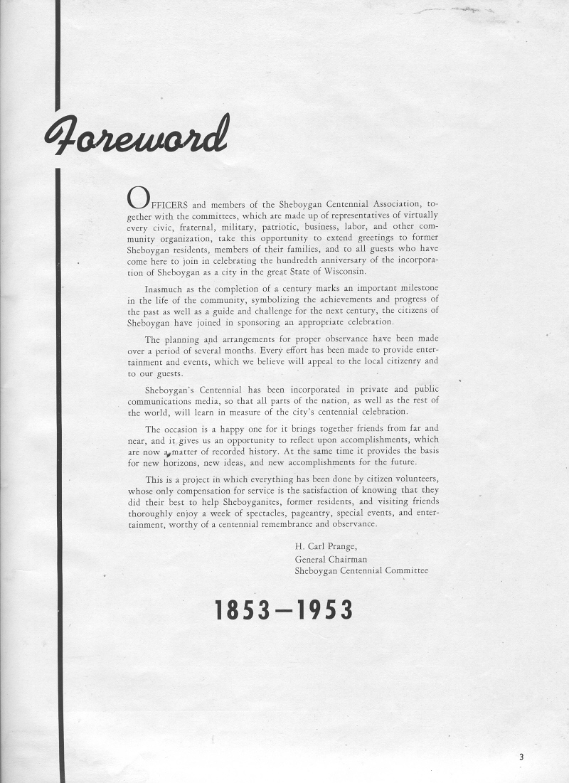 1953 Sheboygan Centennial Celebration, Page 3, Foreword: