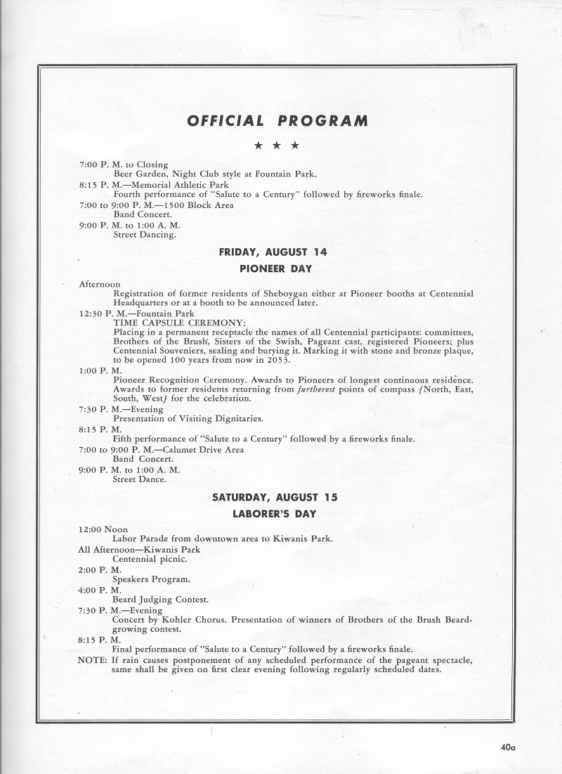1953 Sheboygan Centennial Celebration, Page 40a, Official Program, Sheboygan Centennial Celebration, Page 3: