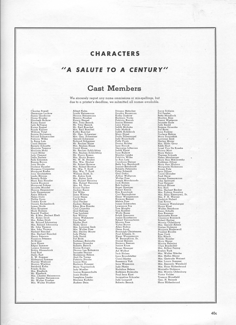 1953 Sheboygan Centennial Celebration, Page 40c, Official Program, Play: "A Salute to a Century," Characters and Cast Members, Page 1: