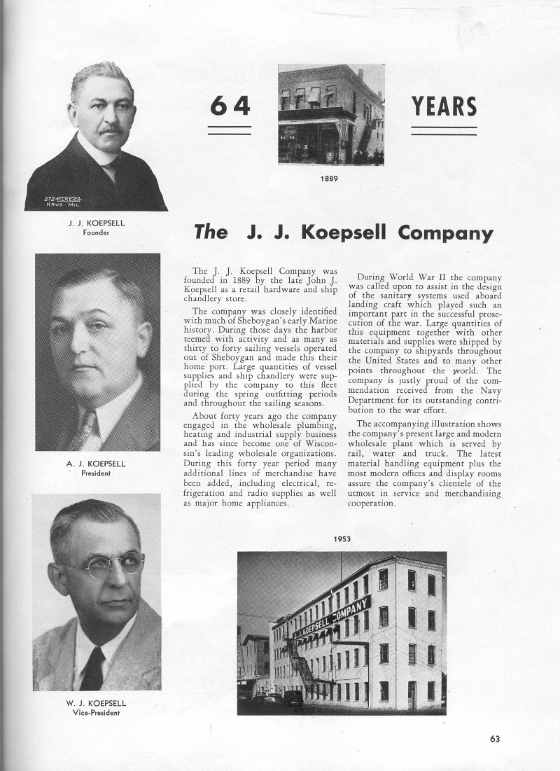 1953 Sheboygan Centennial Celebration, Page 63, Ad for The J. J. Koepsell Company (photos):