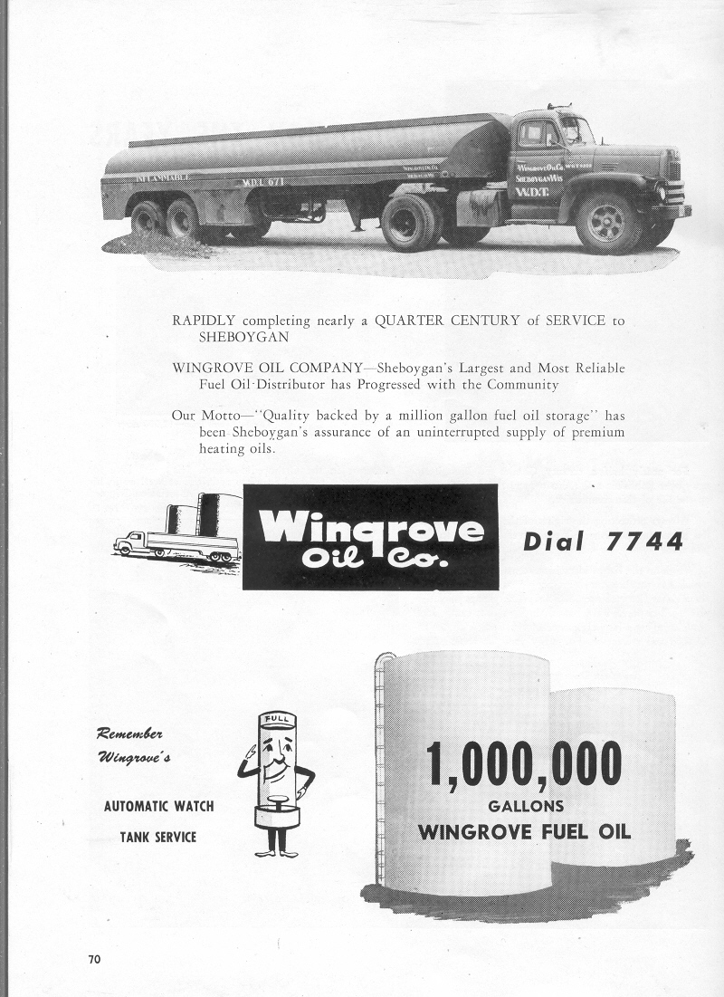 1953 Sheboygan Centennial Celebration, Page 70, Ad for the Wingrove Oil Co. (illus. & photo):